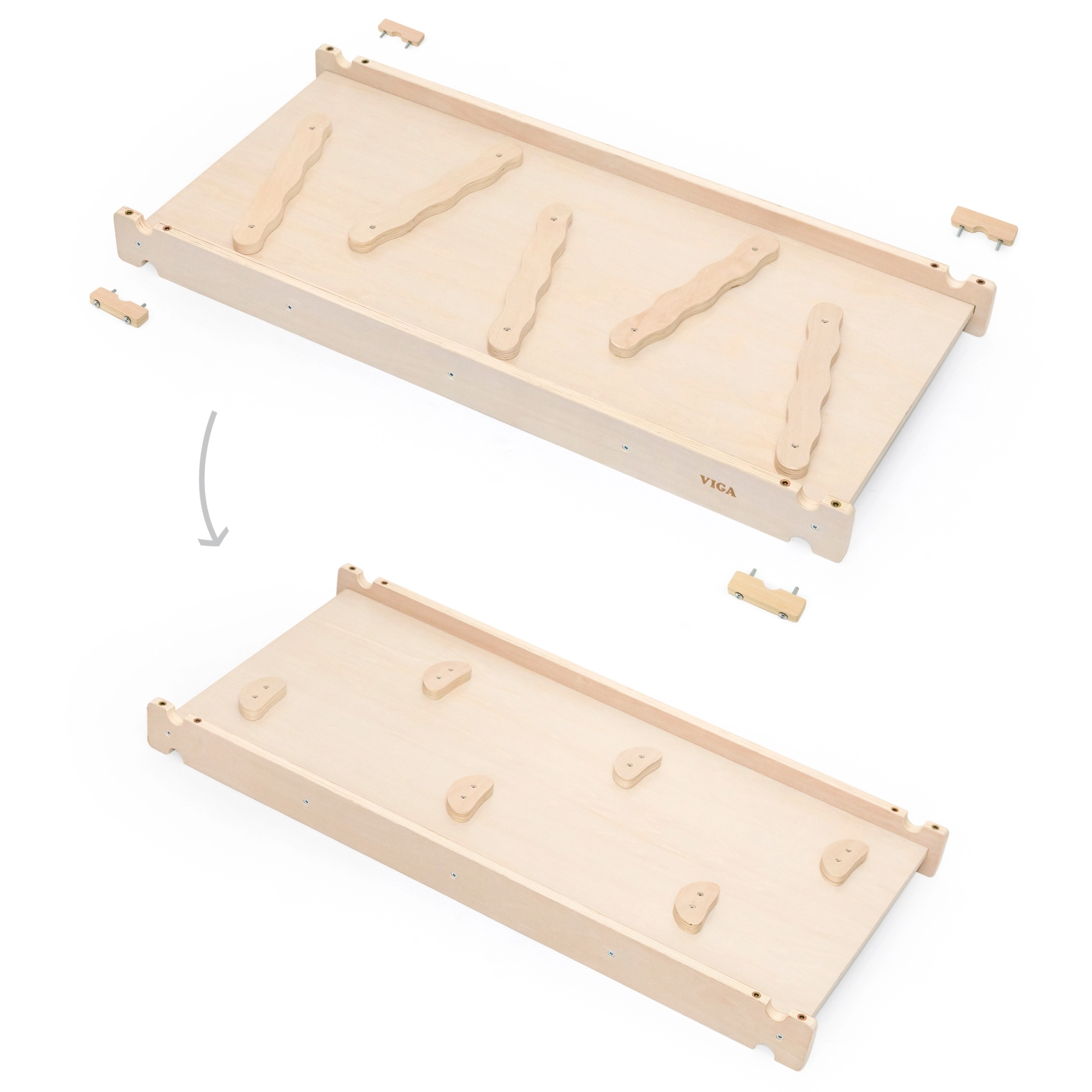 Jedna strana pro hladké klouzání a balanční chůzi, druhá s úchyty jako motivující lezecká stěna pro každodenní pohyb.