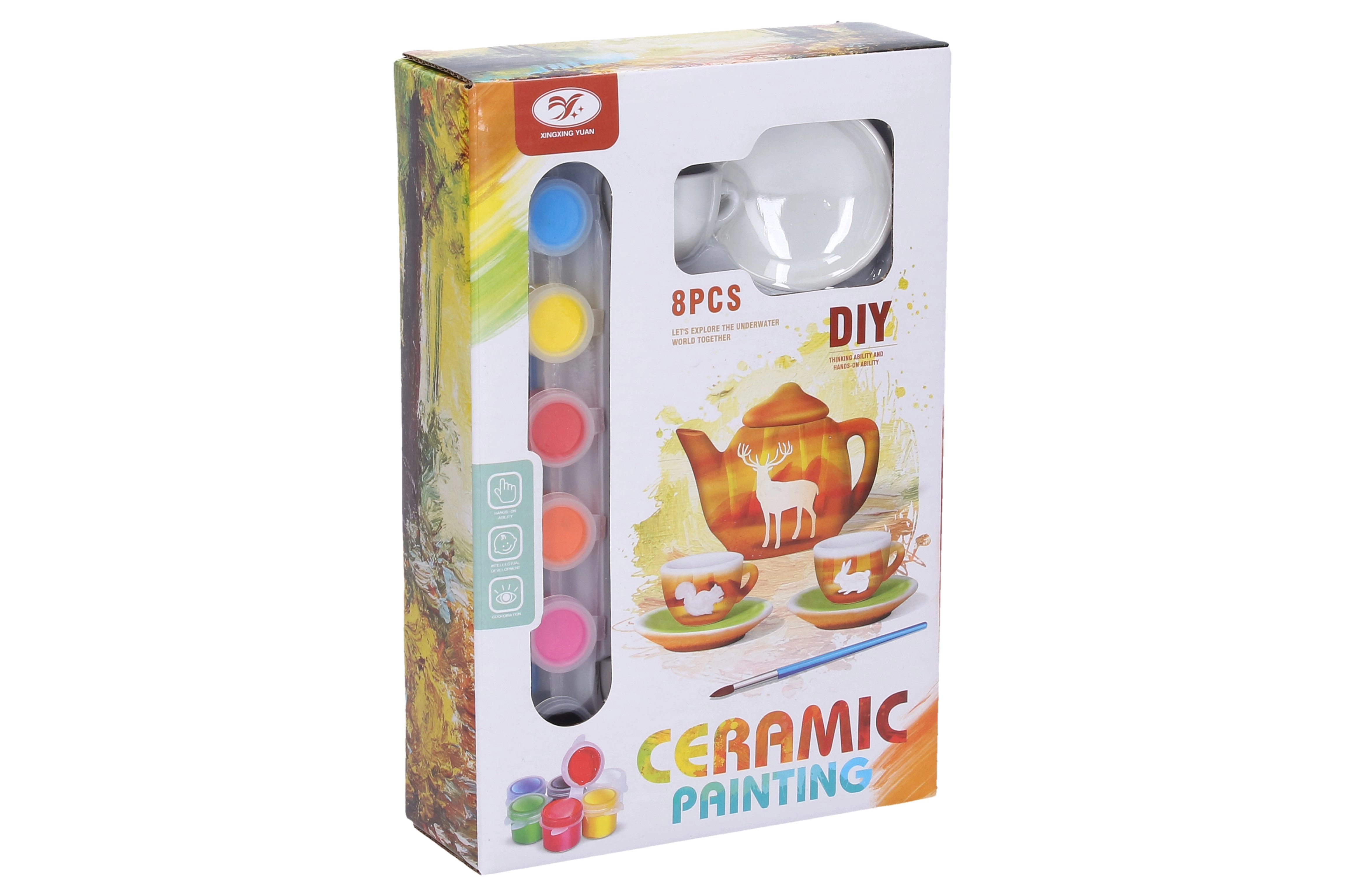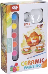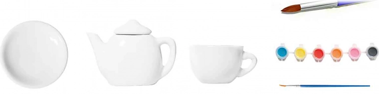 - Kompletní balení: konvička s pokličkou, 2 hrnečky, 2 podšálky, 6 barev, štětec