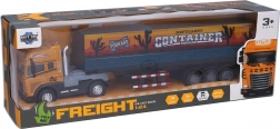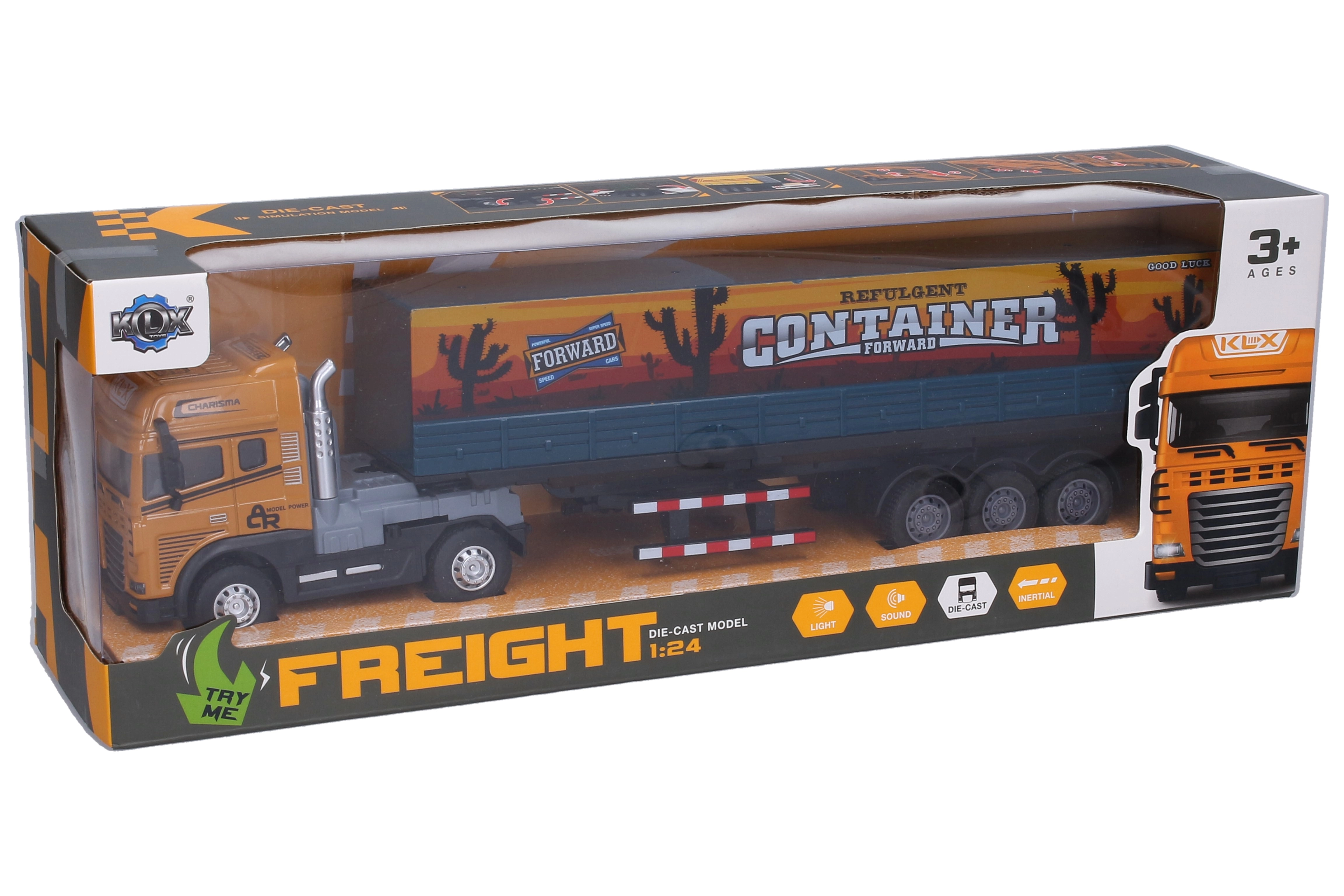 Realistický kovový tahač s odpojitelným kontejnerovým návěsem potěší malé i velké řidiče. Nabízí světelné a zvukové efekty, setrvačník pro plynulou jízdu, otevírací dvířka kontejneru a aktivaci efektů pohybem předních kol. Délka modelu je 40 cm, baterie 3× AG13 jsou součástí balení.