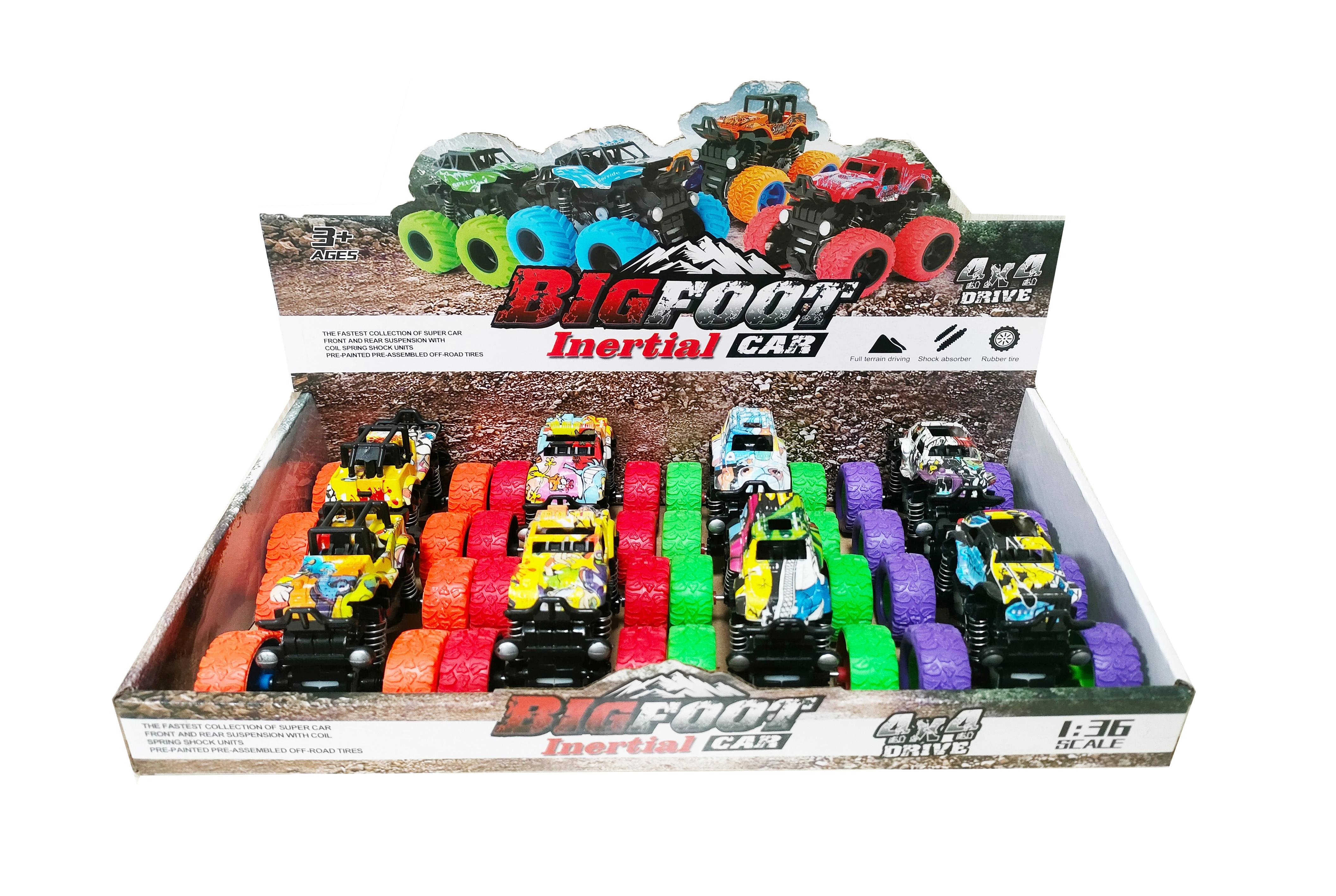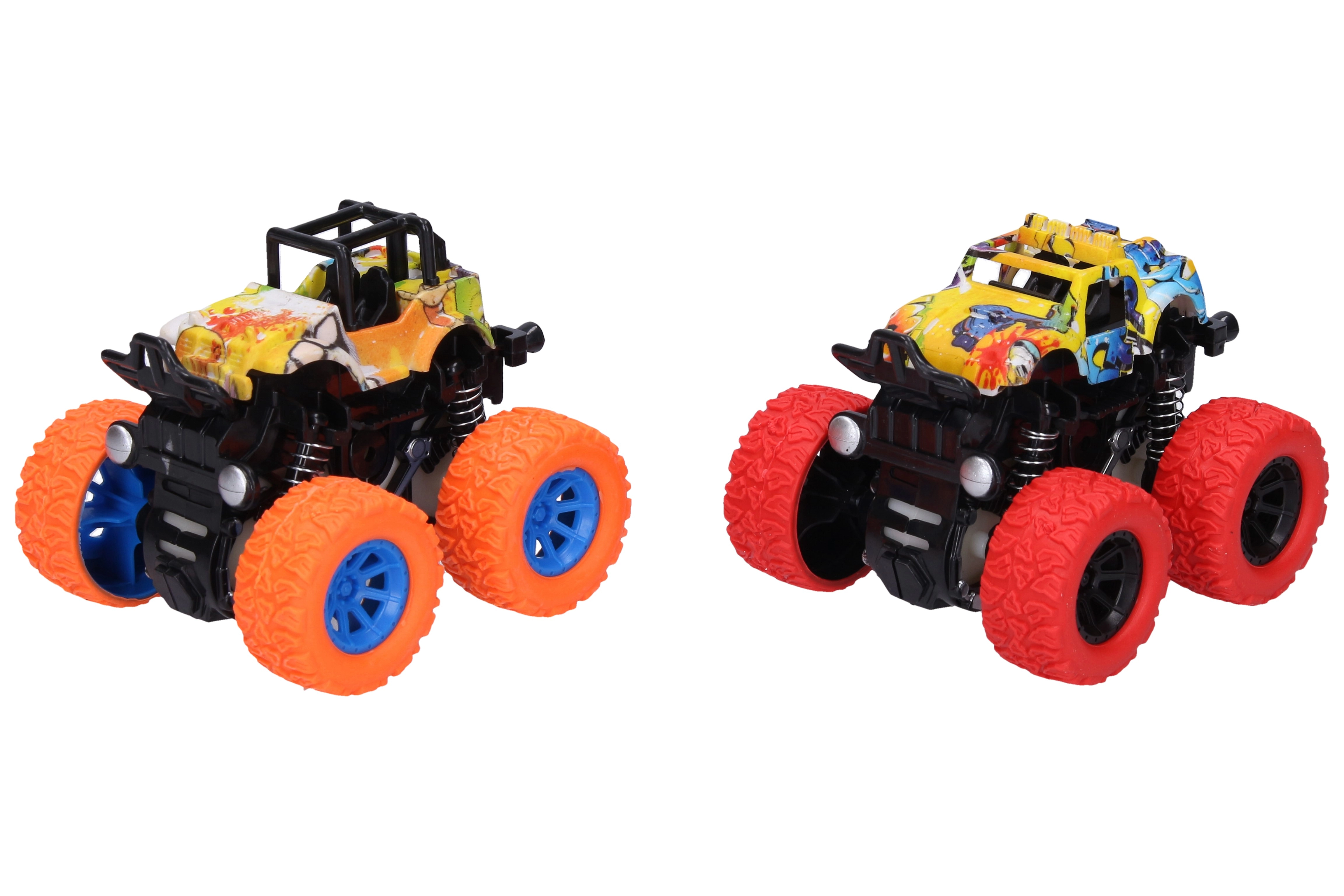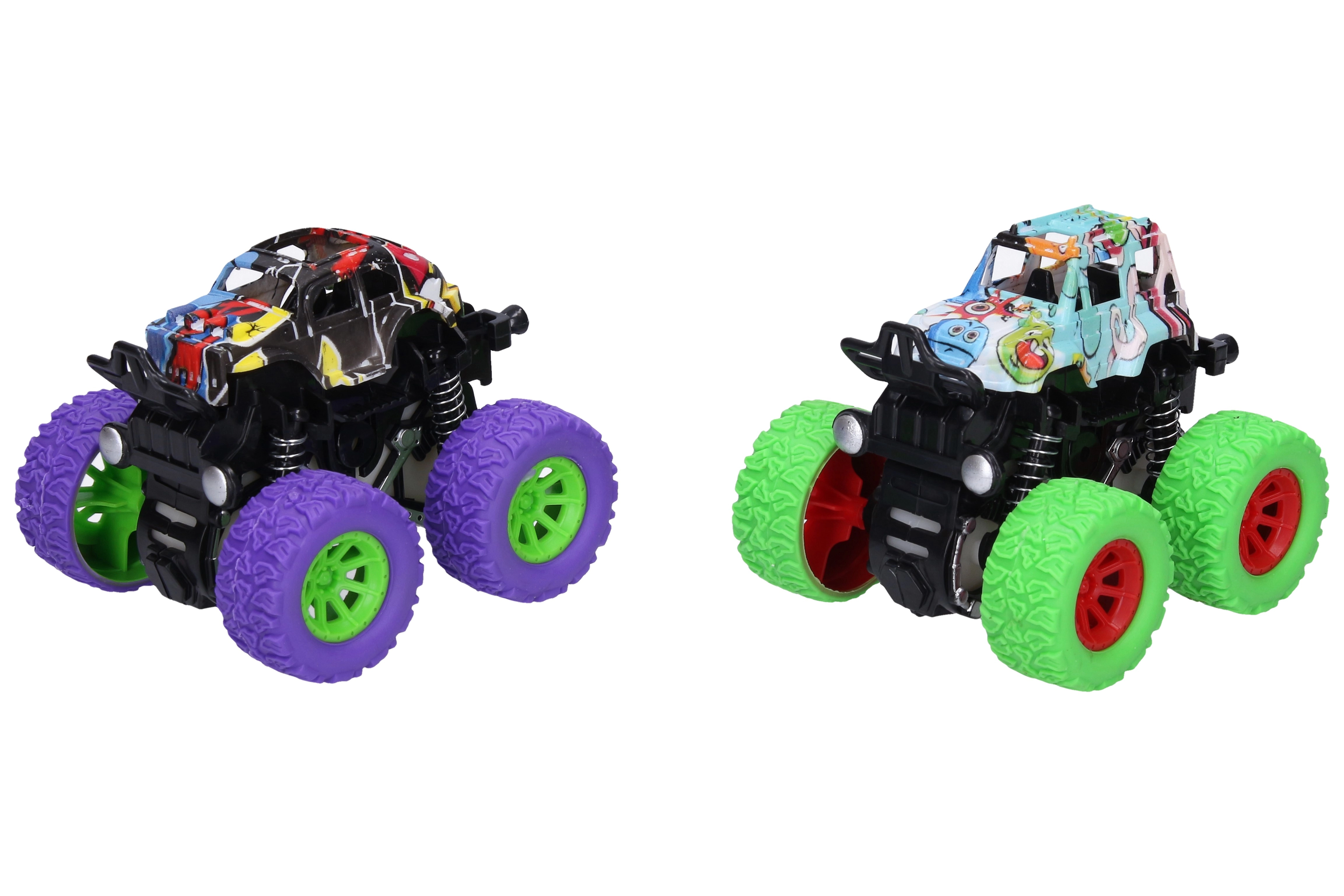 Tato terénní autíčka o velikosti cca 9 cm s frikčním pohonem (setrvačník) stačí natáhnout a pustit – vyrazí vpřed vysokou rychlostí. Stylové karoserie s graffiti motivy v různých barevných variantách přitahují pozornost a podporují kreativní hru.
