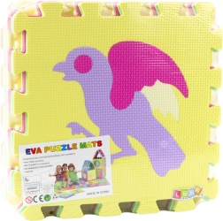 Podlahová pěnová puzzle podložka z EVA se skládá z 9 velkých dílů (30,5 × 30,5 cm) v živých barvách. Vyjímatelné vložky ve tvaru zvířat (např. ptáček, medvěd, kohout) zajišťují zábavné učení a podporují koordinaci ruka–oko. Texturovaný, protiskluzový povrch je příjemný na dotek a měkká pěna tlumí pády i hluk.