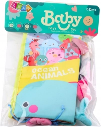 Měkké látkové stránky s vystupujícími ocásky a visačkami motivují děti k uchopení, mačkání a zkoumání povrchů – ideální pro rozvoj jemné motoriky.