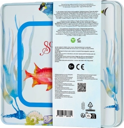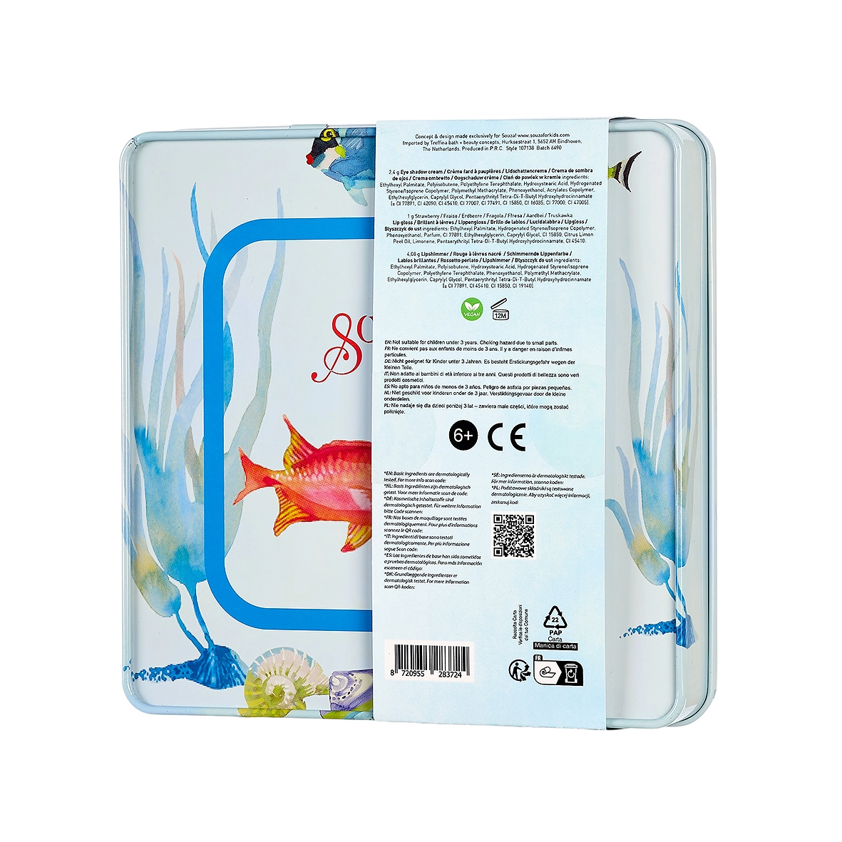 Elegantní dětská make-up sada v kovovém pouzdře s motivem mořské víly potěší malé parádnice od 6 let. Obsahuje třpytivé oční stíny (růžový, zlatý, modrý), 6 krémových rtěnek v odstínech růžové a tekutý lesk na rty s jahodovou příchutí. Součástí je dvojitý aplikátor. Kosmetika je dermatologicky testovaná, snadno omyvatelná, 100% veganská a netestovaná na zvířatech.