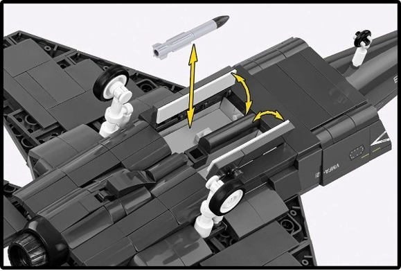 Stavebnice obsahuje 614 precizně vyrobených dílků s odolnými potisky, takže vzhled zůstane dlouhodobě výrazný. Užijete si otevíratelnou kabinu, polohovatelná řídicí kormidla, gumová kola a bombovnici. Nechybí ani stojánek pro efektní vystavení a figurka pilota v americké letecké výstroji.