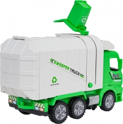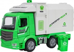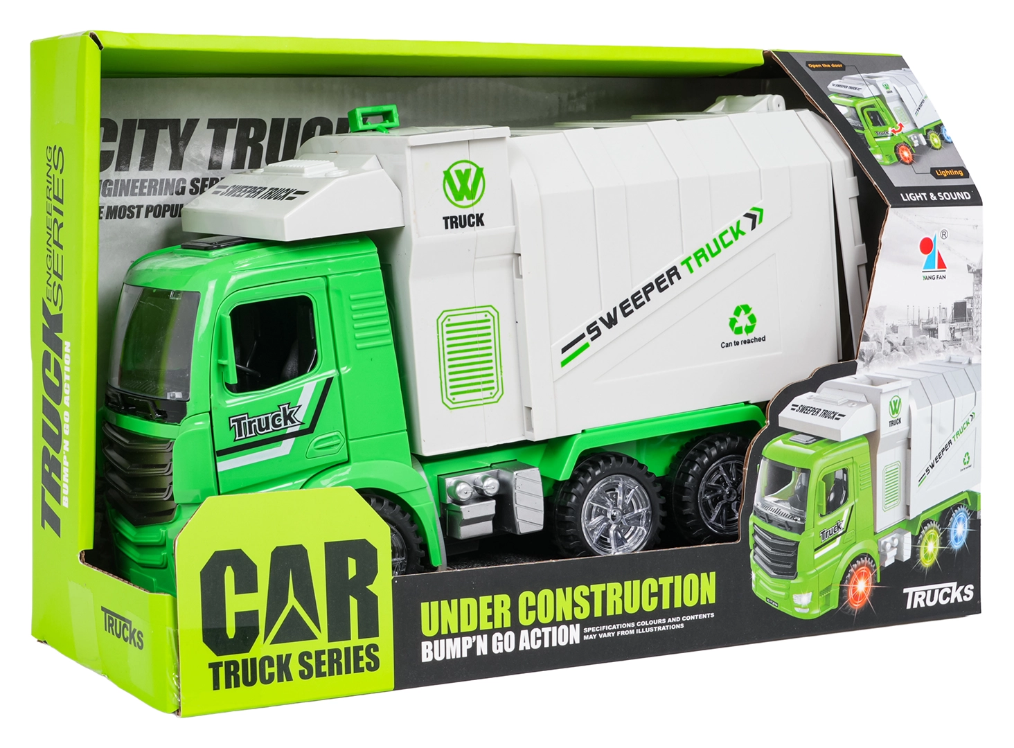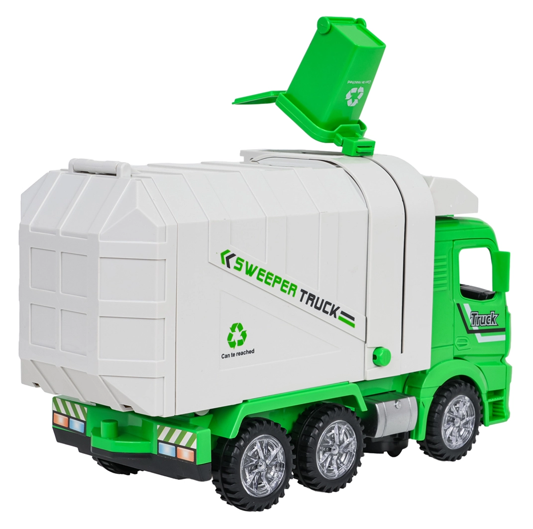 Zvukové efekty jako jízda, brzdění, klakson a veselá melodie dělají ze hry realistický zážitek. Přiložený koš na odpad snadno zavěsíte na bok auta a vyklopíte obsah do zásypu. Hračka je napájena 3× AA 1,5 V bateriemi (nejsou součástí balení).