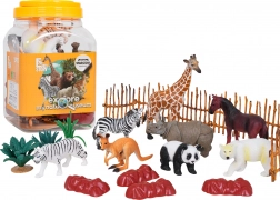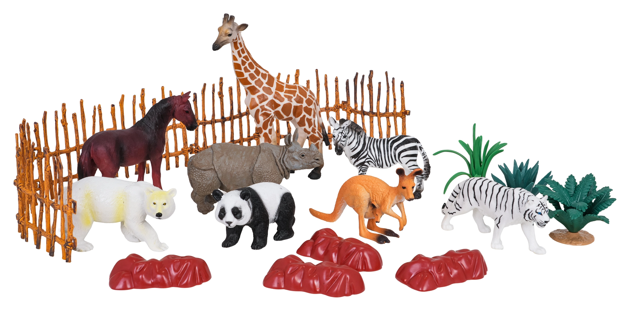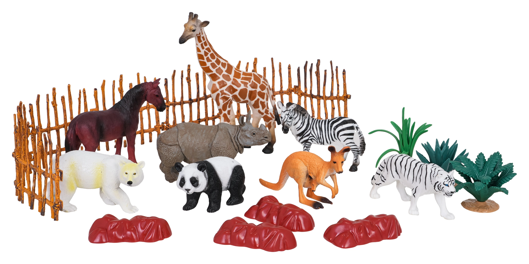 - Plastový dóz s rukojetí (obal); figurky: klokan, panda, lední medvěd, tygr, nosorožec, zebra, kůň, žirafa; 3× rostlina; 4× skála; 7× díl ohrady; návod s popisem zvířat (EN)