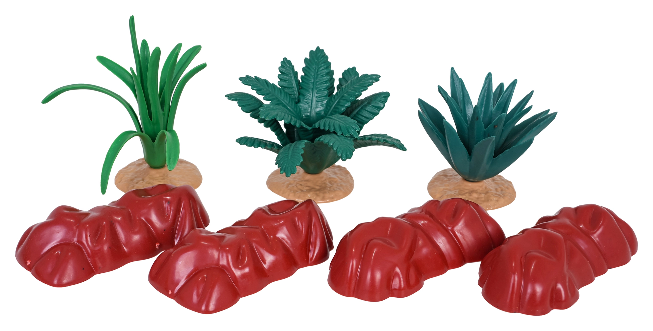 - Pevné doplňky: 7 dílů ohrady, 4 skály, 3 rostliny
