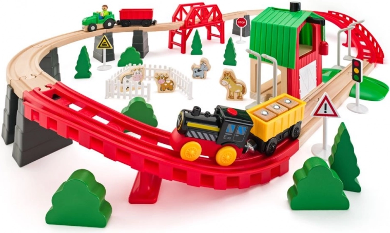 Dřevěná vláčkodráha Život na farmě přináší dětem autentický svět farmy s vláčkem, kolejnicemi a tematickými doplňky. Děti si mohou vytvářet vlastní příběhy, rozvíjet koordinaci ruka–oko a učit se základním principům cause–effect při posouvání vláčku po kolejích.