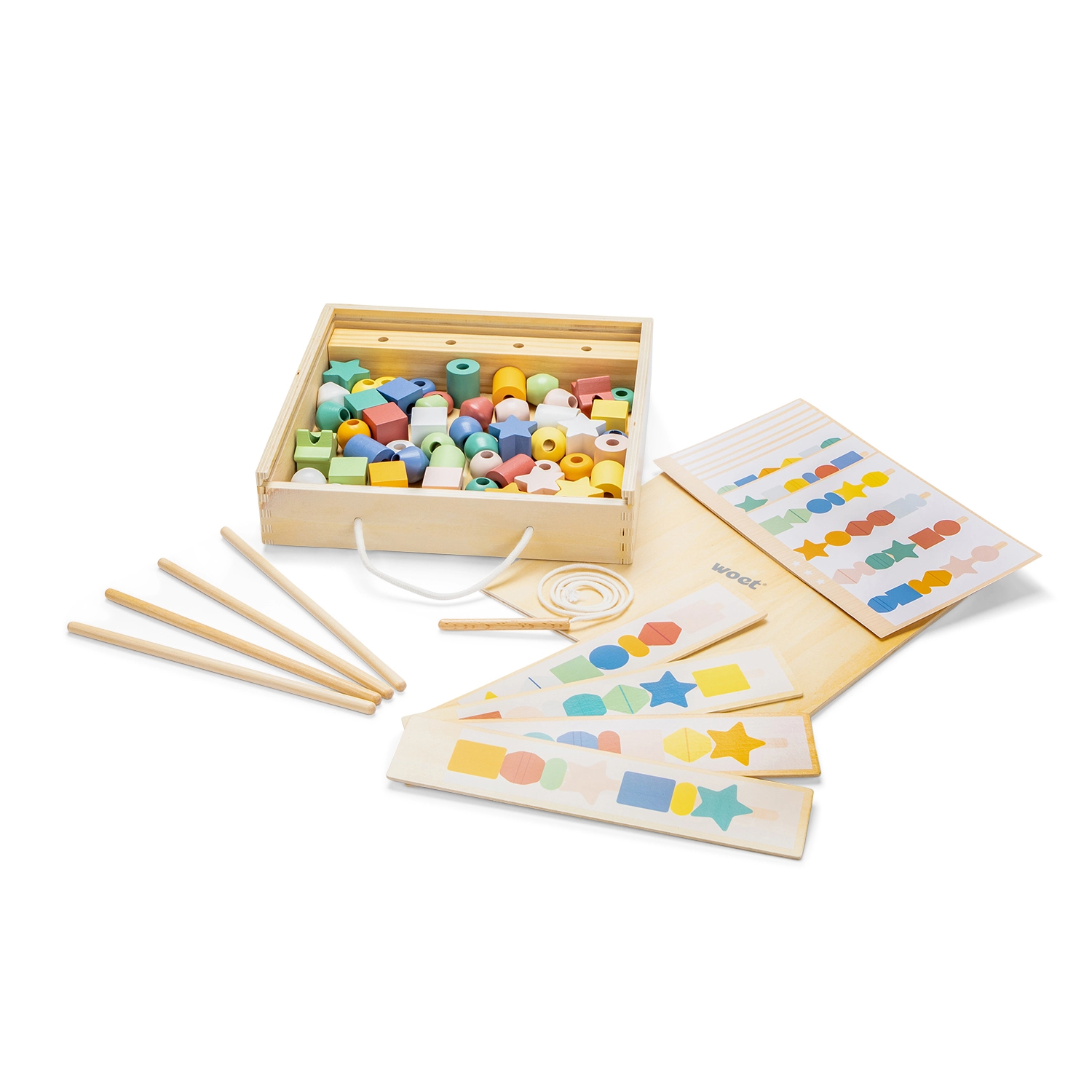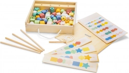 - Dřevěná krabička s víkem, 56 barevných korálků, 8 oboustranných kartiček se vzory, 4 třídicí stojany s kartičkami, navlékací provázek