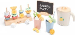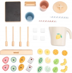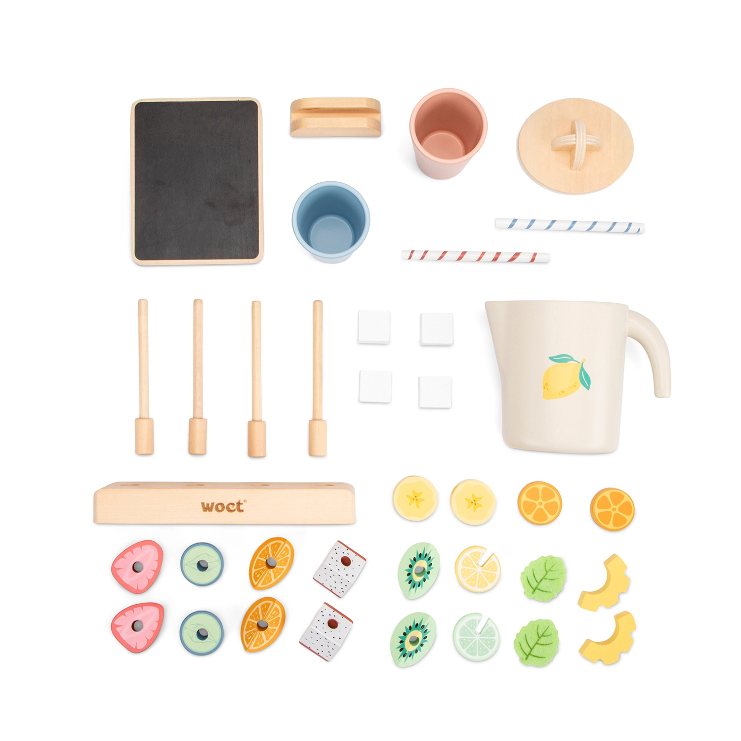 Tato veselá dřevěná hrací sada přináší vše, co děti potřebují k přípravě limonády a ovocných pochoutek. Jednoduše naplňte kelímek, přidejte plátky ovoce, ozdobte brčkem a servírování může začít. Děti mohou míchat různé kombinace, vymýšlet vlastní recepty a rozvíjet fantazii při hraní na piknik nebo stánek s občerstvením.