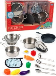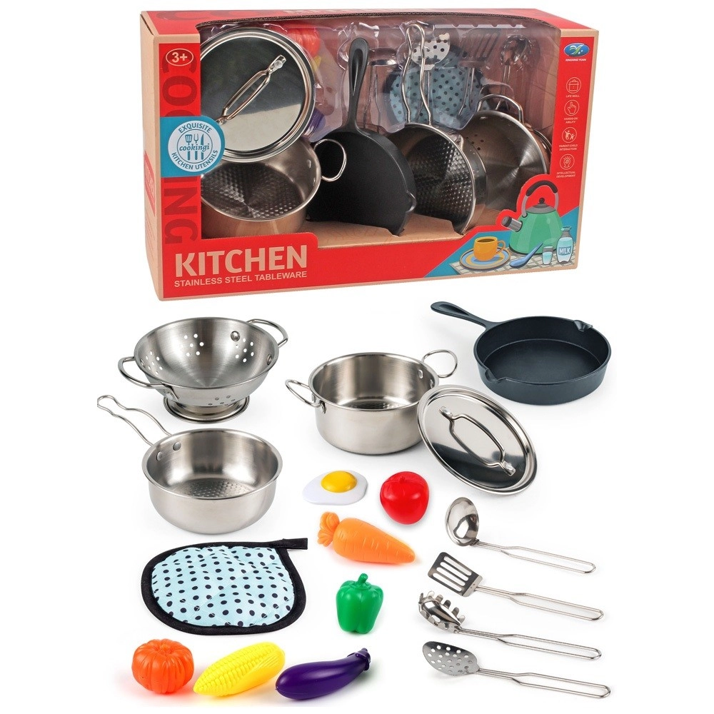 Objevte zábavnou kovovou kuchyňskou sadu pro malé kuchaře s celkem 17 prvky. Součástí jsou hrnec, pánev, pokličky, cedník, kuchyňské náčiní, plastová zelenina i textilní podložka. Skvělá hračka pro rozvoj kreativity, jemné motoriky a hraní na kuchaře.