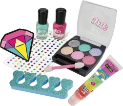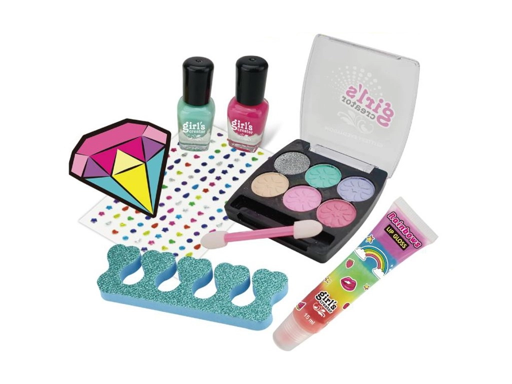 - Kompletní výbava: 2 barevné laky na nehty, nálepky na nehty, podpěra prstů, malovací set na obličej, lesk na rty.