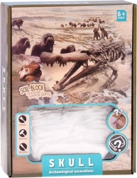 Dvě dlátka, kladívko a štětec umožní dětem postupně vysekávat a jemně čistit nalezenou lebku – přesně jako při skutečném vykopávání.