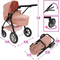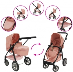 Stylový kočárek pro panenky 2v1 v růžovém provedení nabízí luxusní zpracování, odnímatelné sedátko a možnost přeměny na sportovní kočárek. Díky nastavitelné rukojeti, otočnému přednímu kolu a velkému koši je ideální pro malé maminky. Vhodné pro panenky do cca 53 cm.