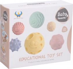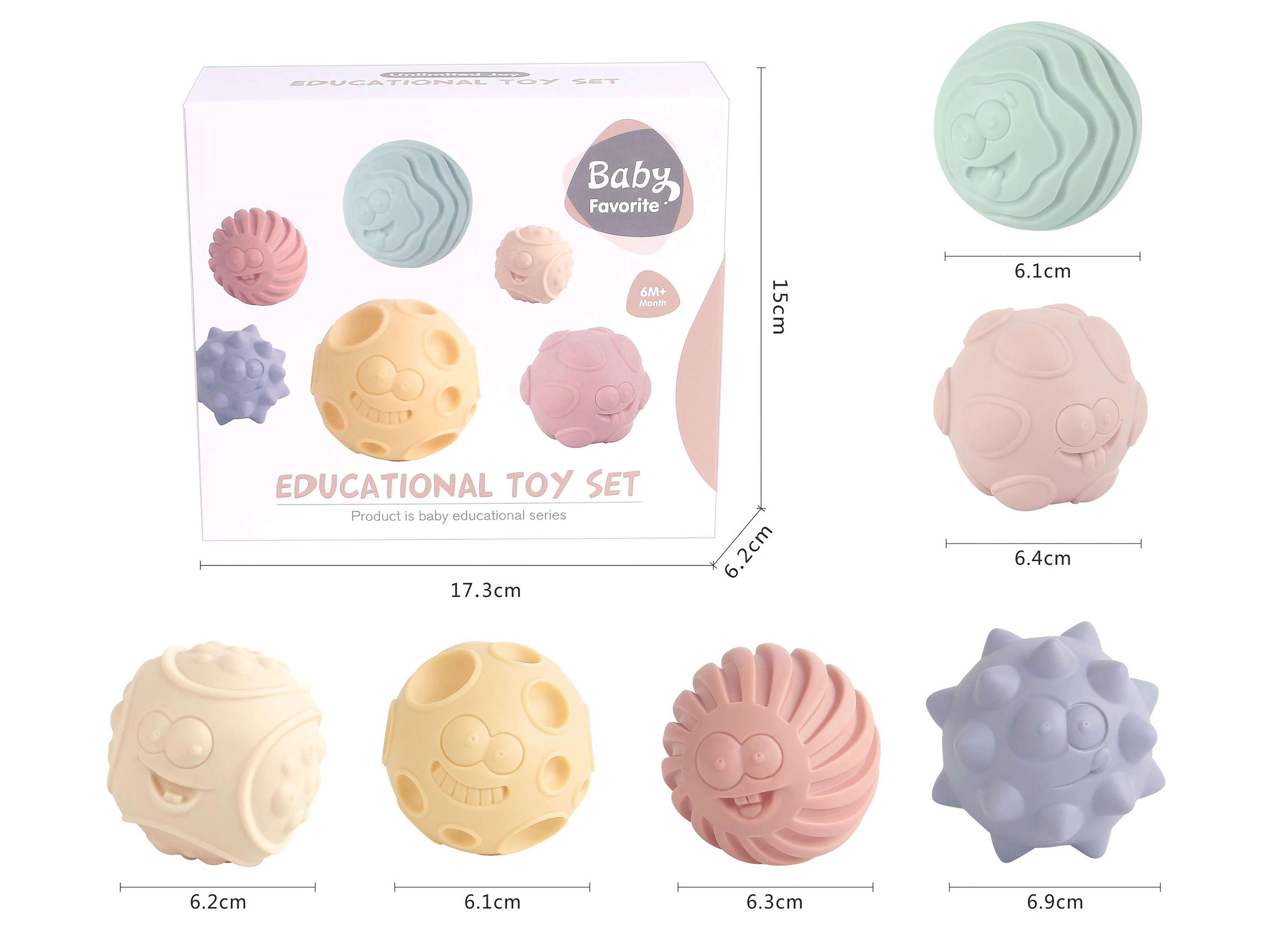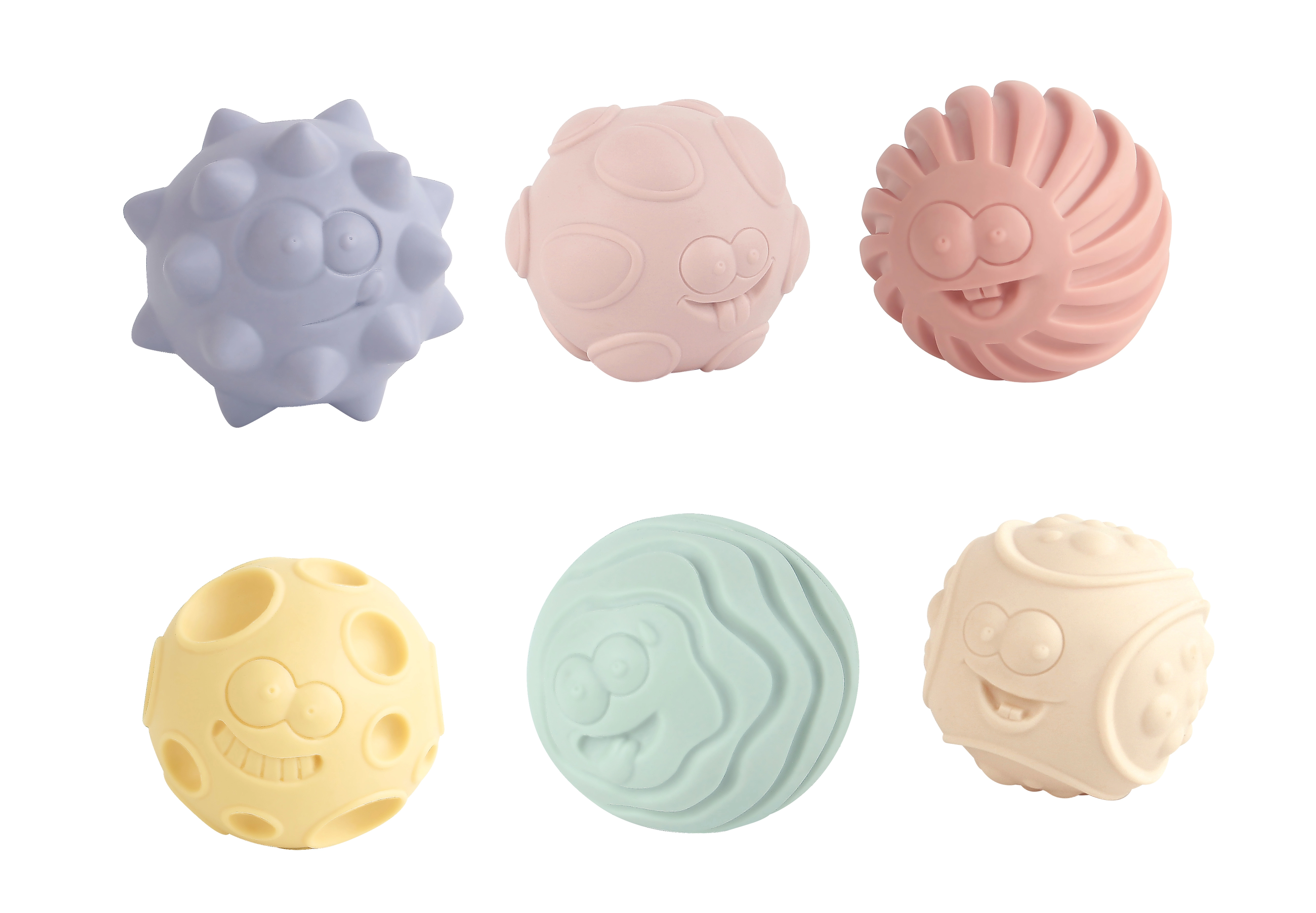 Zábavná sada motorických míčků pro děti podporuje jemnou motoriku, smyslové vnímání a hmatové zkoumání. Obsahuje 6 měkkých míčků o průměru 6 cm s různými texturami, které jsou bezpečné pro malé ruce a při stisku pískají pro ještě větší smyslovou stimulaci.