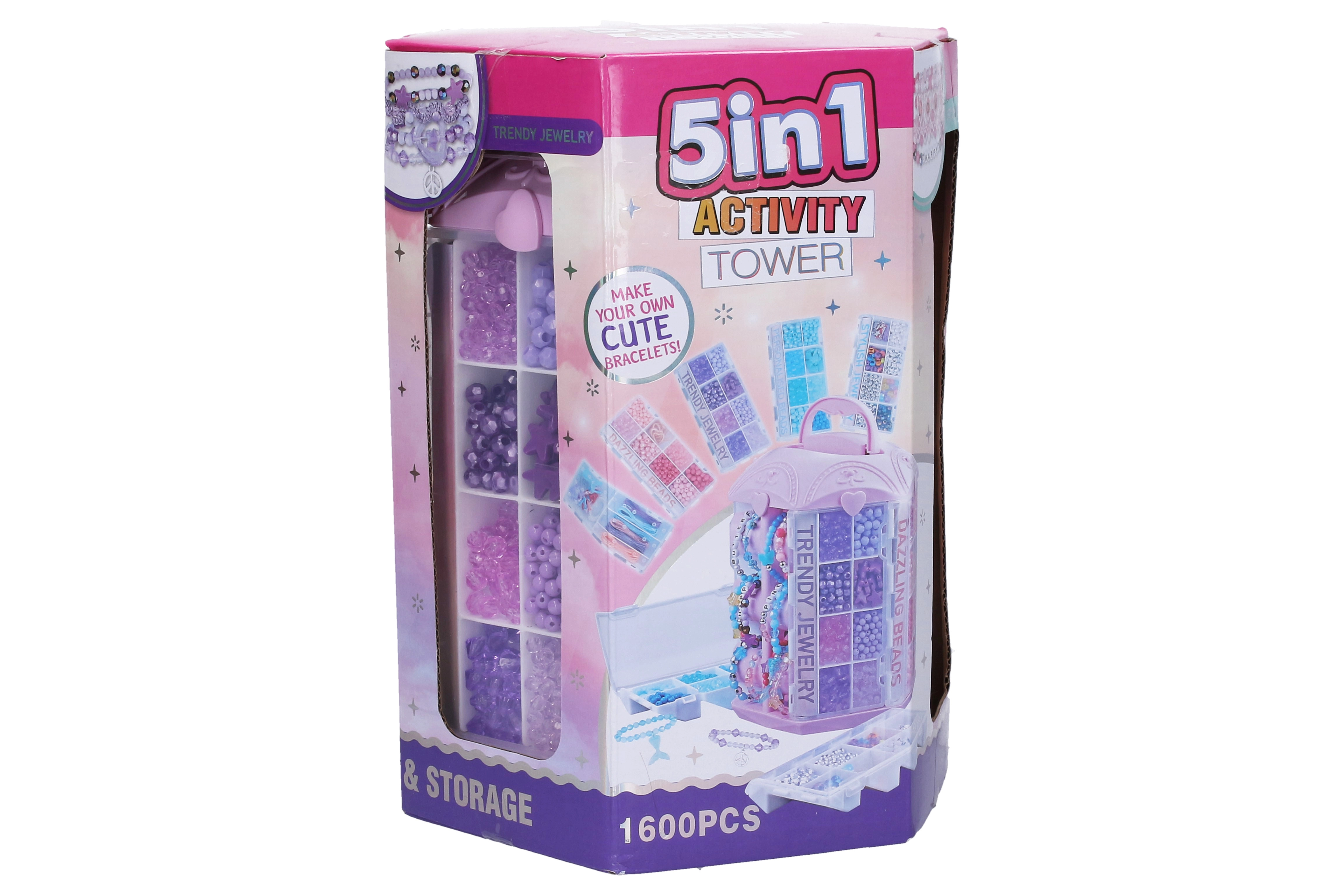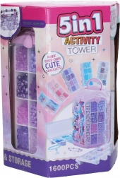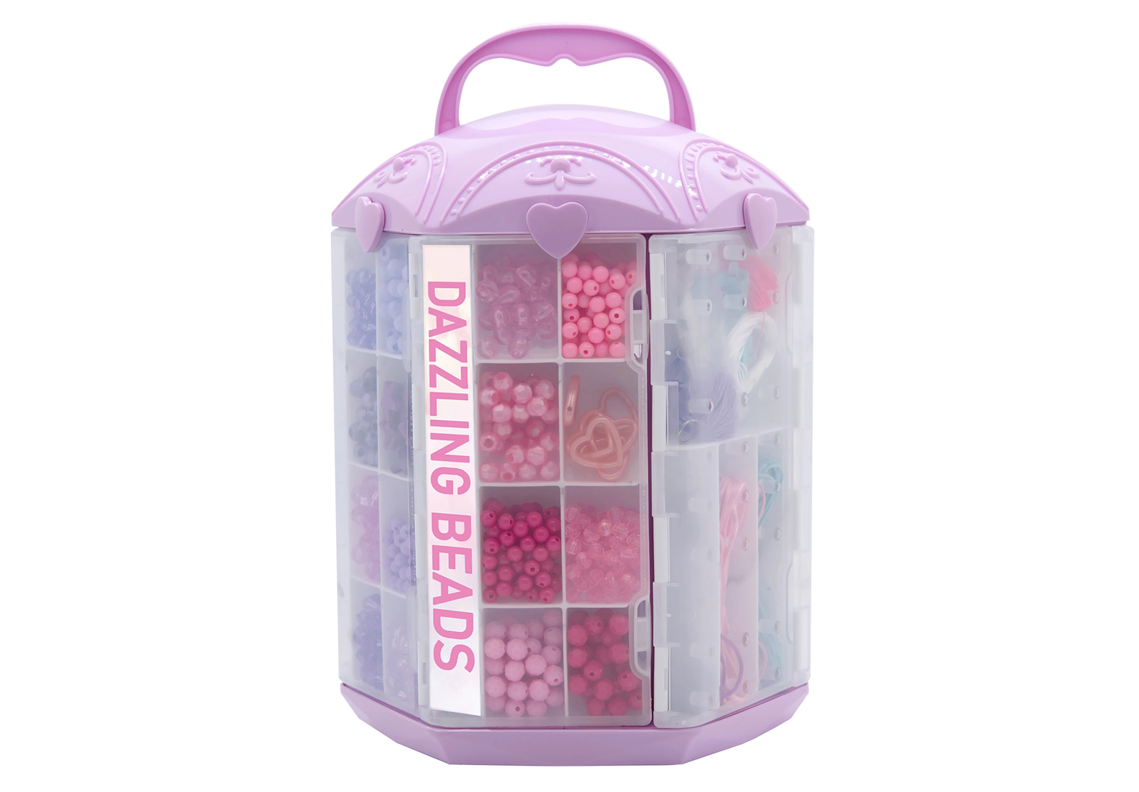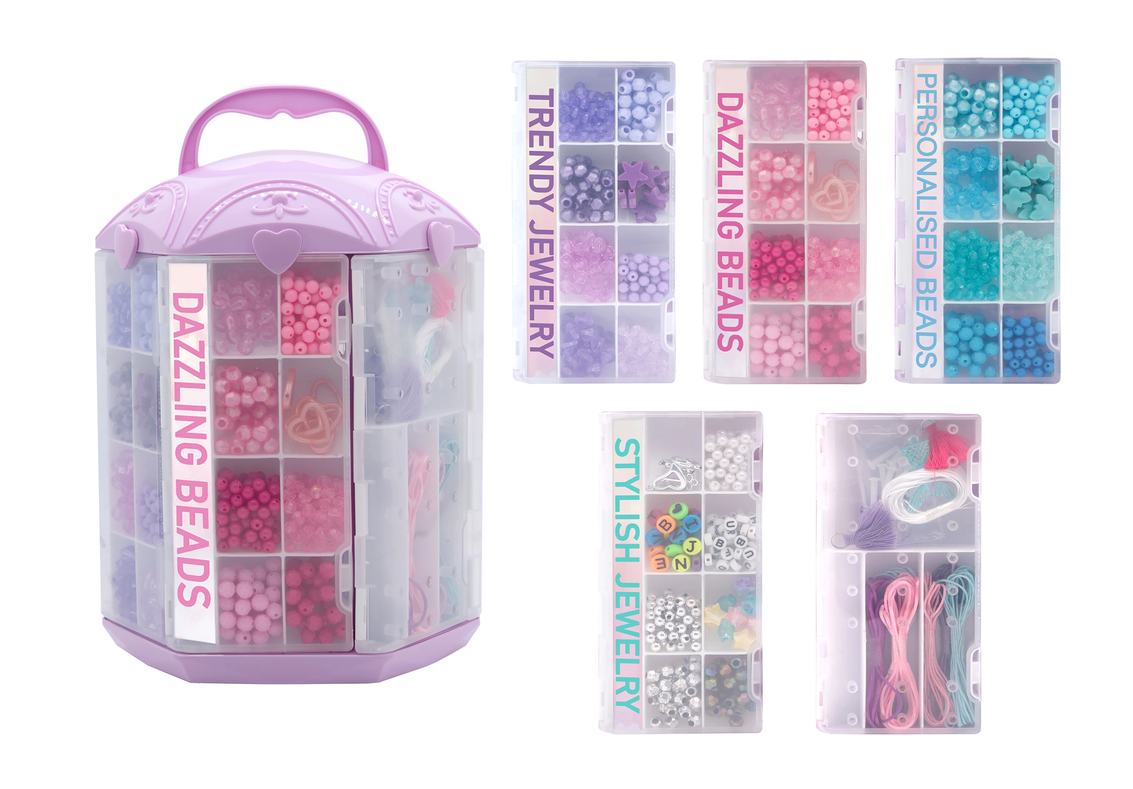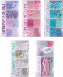 Praktická sada pro tvorbu náramků s přehlednou skříňkou o délce 27 cm. Obsahuje 5 krabiček s korálky a provázky pro vlastní design, možnost svislého umístění krabiček pro lepší organizaci, místo na uložení hotových náramků a madlo pro snadné přenášení.