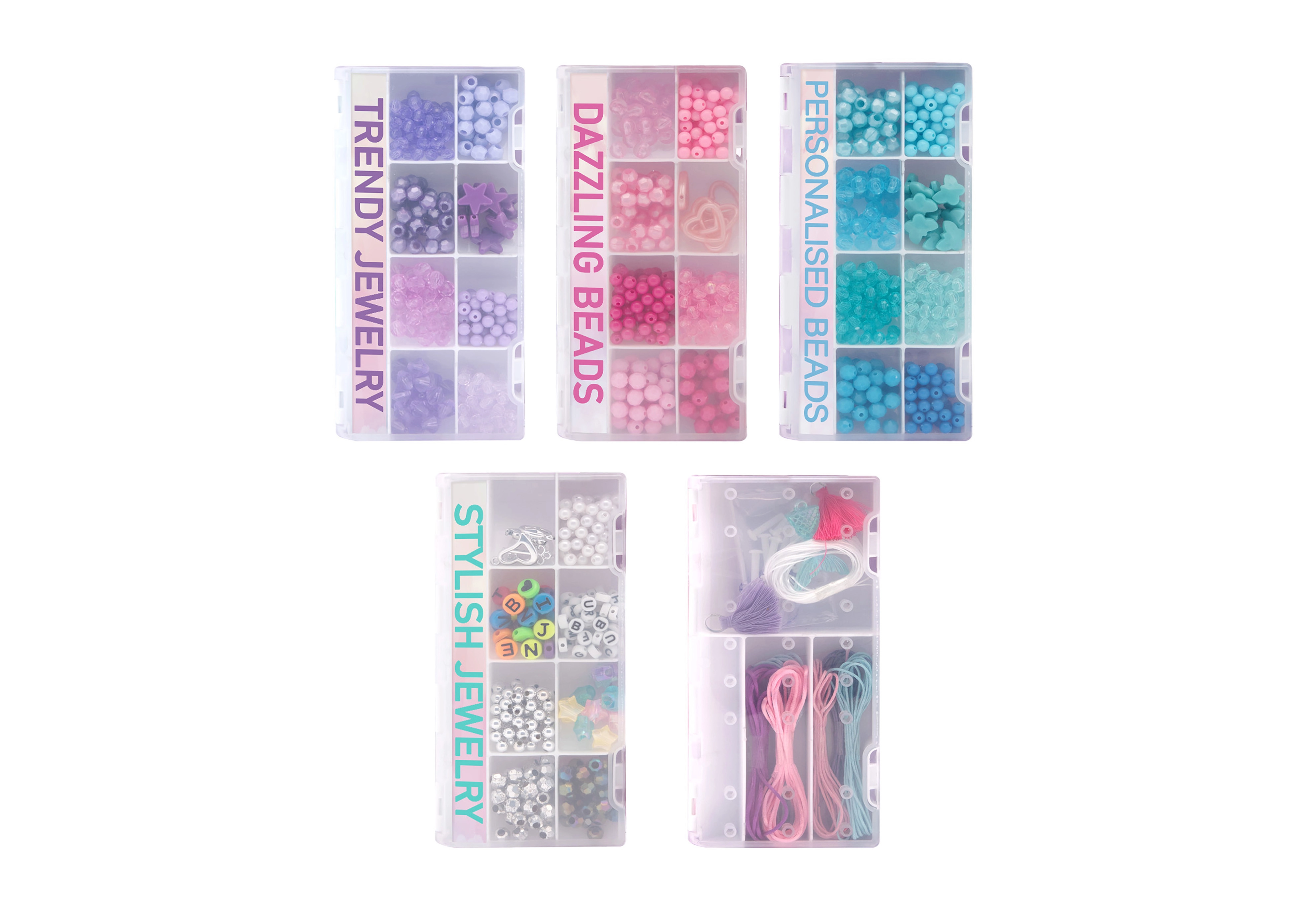 - Kompletní sada – 5 krabiček s korálky a provázky pro tvorbu náramků.