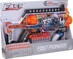 Zábavná dětská zbraň pro akční hry – samopal na pěnové náboje ve stylu revolveru o délce 35 cm. Nabízí rychlou střelbu, bezpečné měkké náboje a jednoduché ovládání na baterie 4× AA (nejsou součástí balení). V balení najdete 24 pěnových nábojů pro dlouhou zábavu doma i venku.