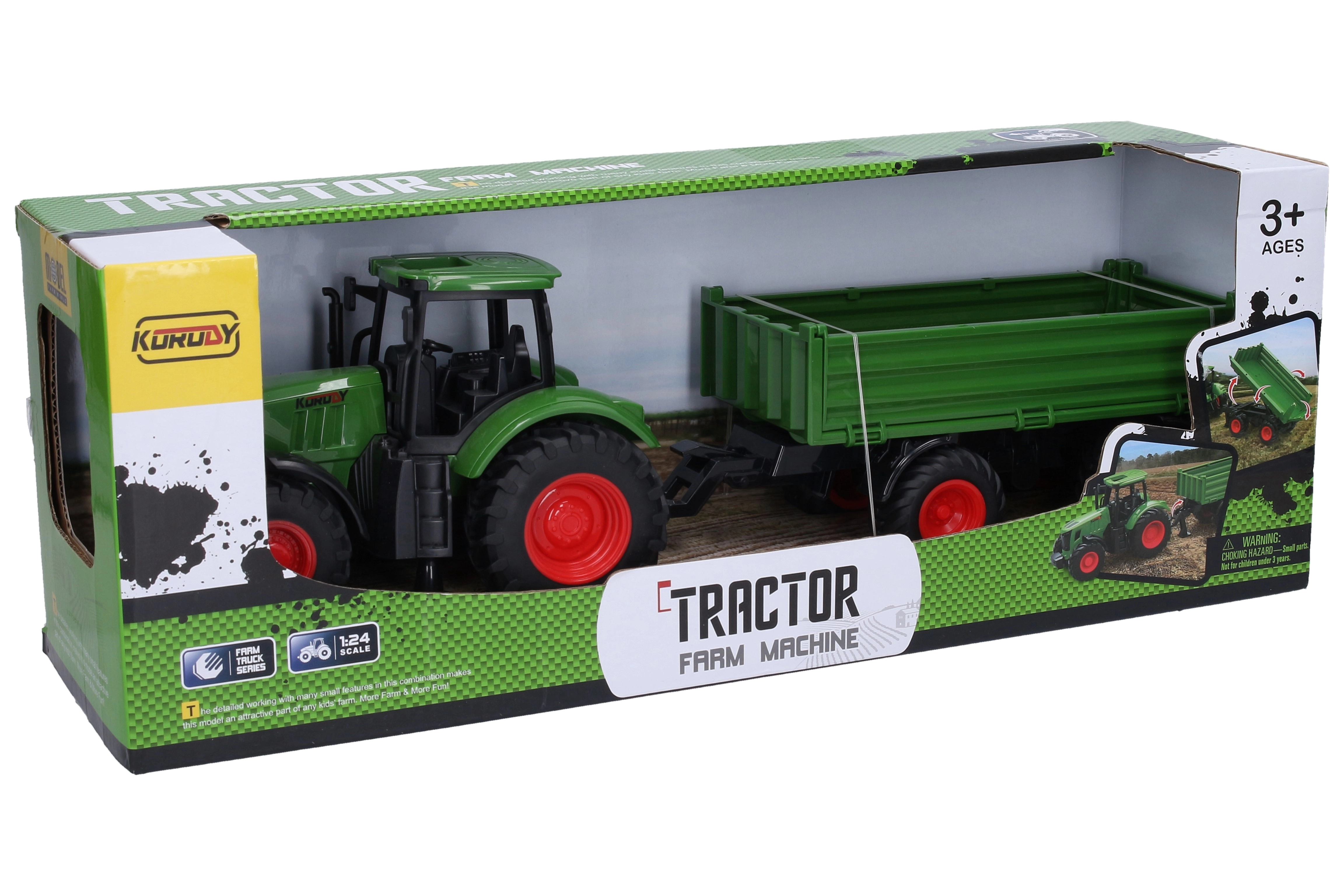 Objevte zábavu na statku s tímto detailně zpracovaným traktorem s přívěsem. Díky volnoběžným kolům se vozidlo snadno ovládá a je ideální pro dětské ruce. Vyklápěcí dvířka přívěsu umožňují realistické nakládání a vykládání, což podporuje kreativní hru a rozvoj motoriky.