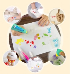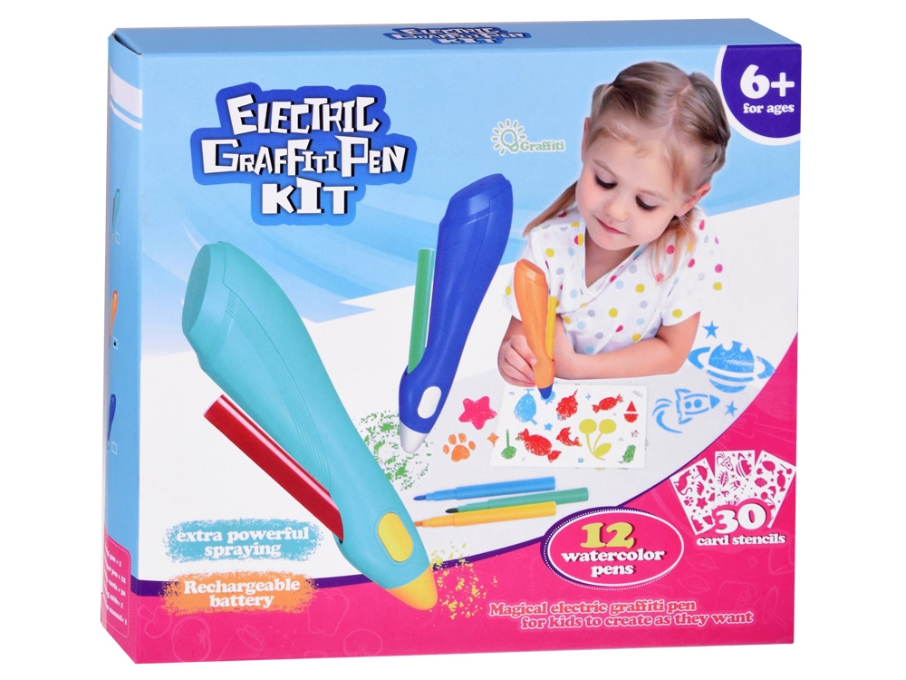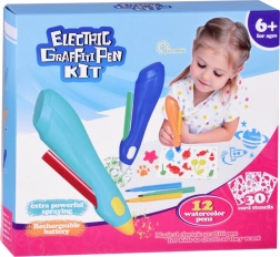 Součástí balení jsou šablony s rozmanitými motivy, 12 barevných fixů a USB kabel pro pohodlné dobíjení. Děti si procvičí fantazii, barvocit i trpělivost – bez nepořádku od sprejů a bez zápachu.