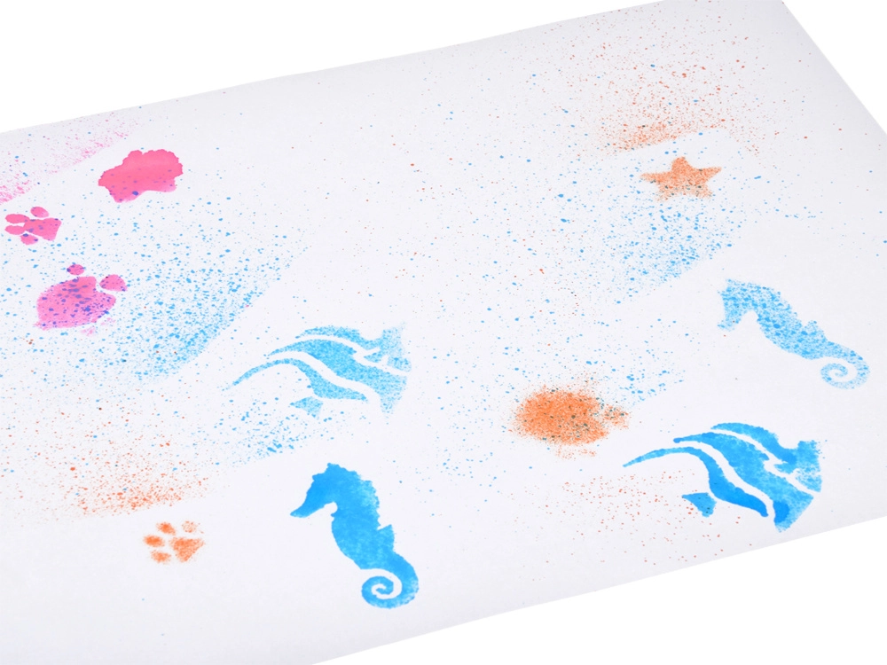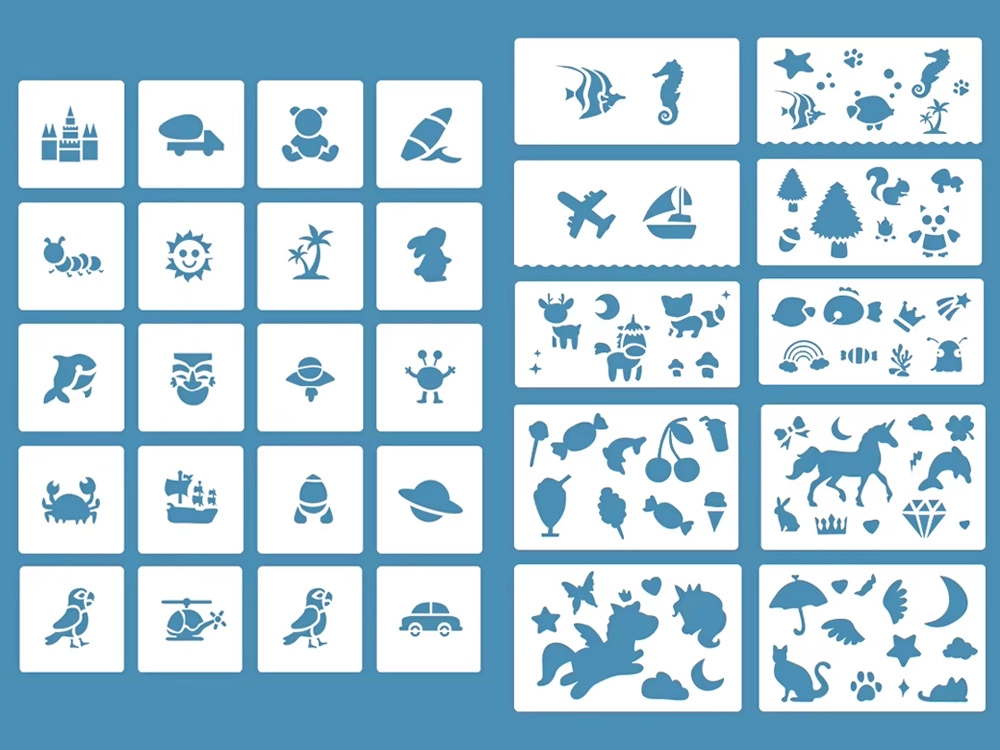 Omývatelné plastové šablony snadno opláchnete vodou a můžete je používat znovu a znovu – od zvířat po hvězdy a další vzory.