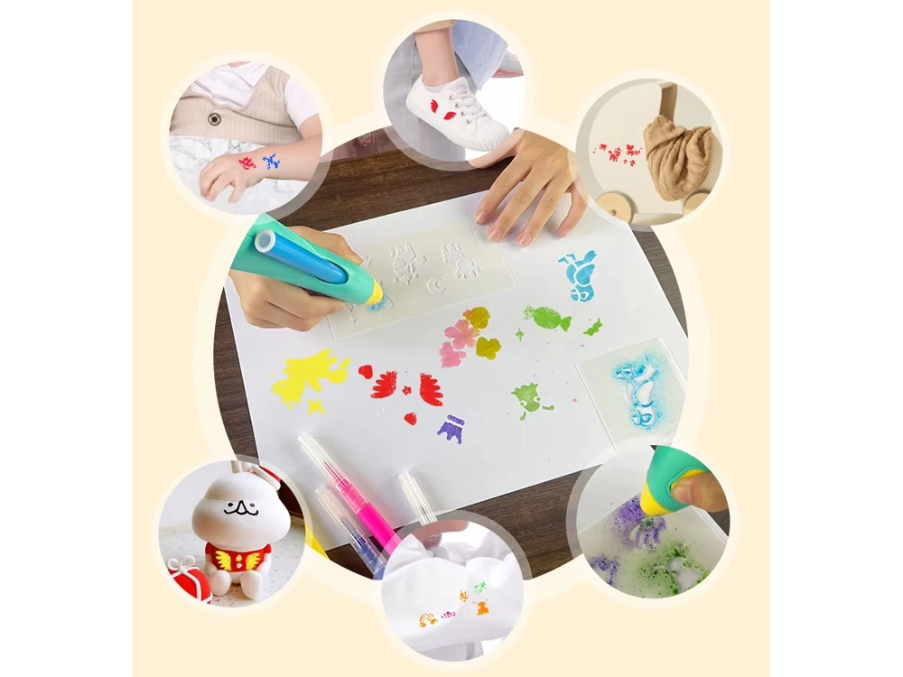 Kreativní airbrush pero pro děti promění běžné fixy v mini „sprej“ a vykouzlí moderní spray art i graffiti efekty. Stačí vložit vybraný fix, stisknout tlačítko a malovat přes znovupoužitelné šablony nebo volnou rukou. Nabíjení USB‑C, ergonomický tvar a pestrá sada šablon i fixů podporují kreativitu a jemnou motoriku.