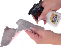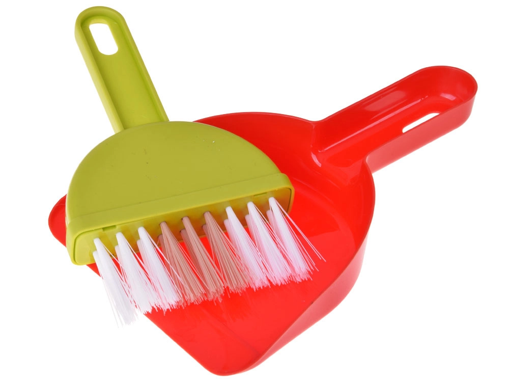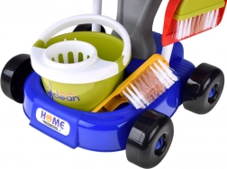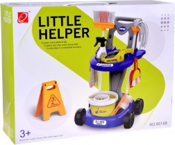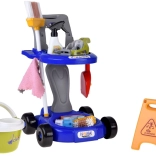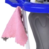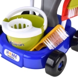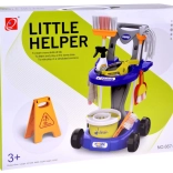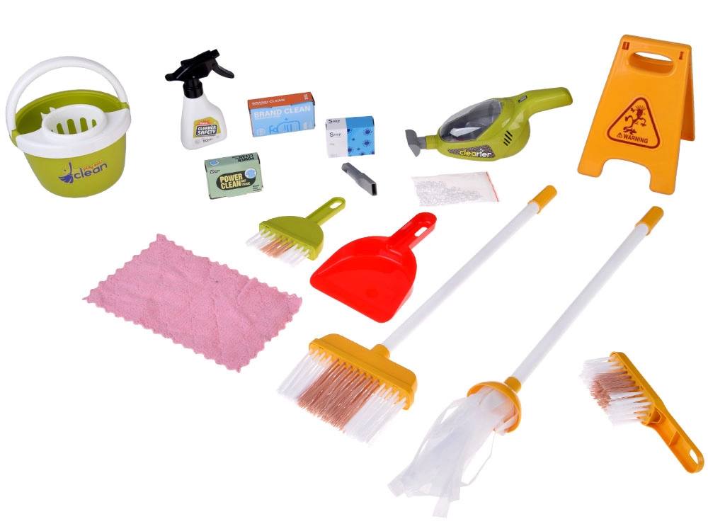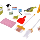 Mop, koště, smetáček a lopatka, kbelík s lisem, hadřík, rozprašovač, varovná cedule a krabičky – vše, co děti potřebují pro nápodobu domácích prací.