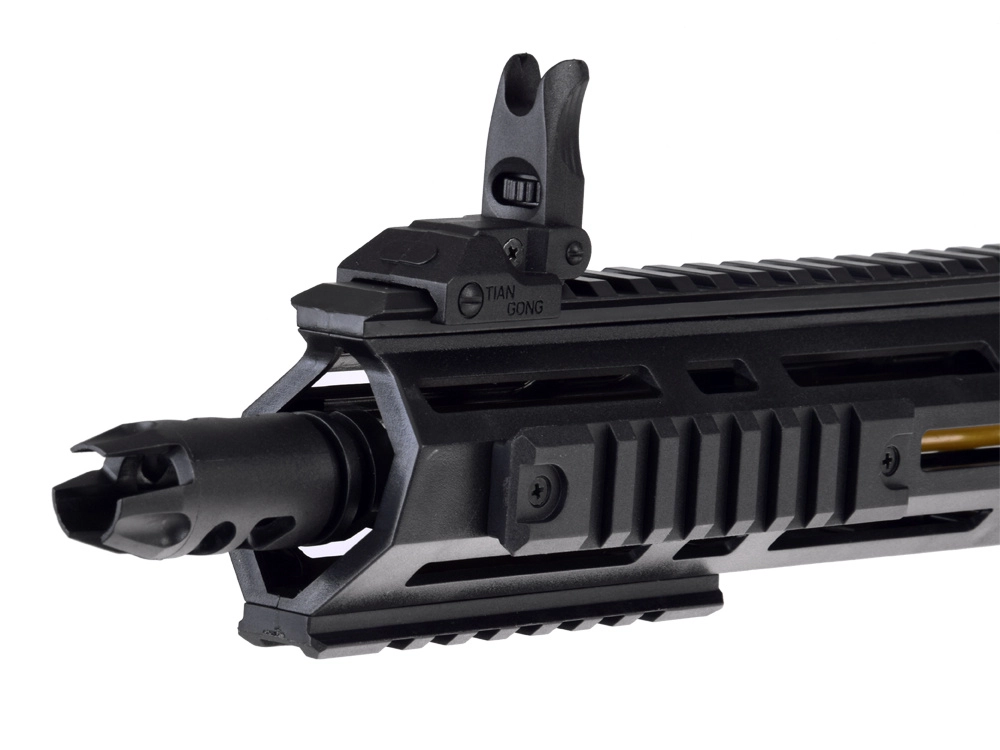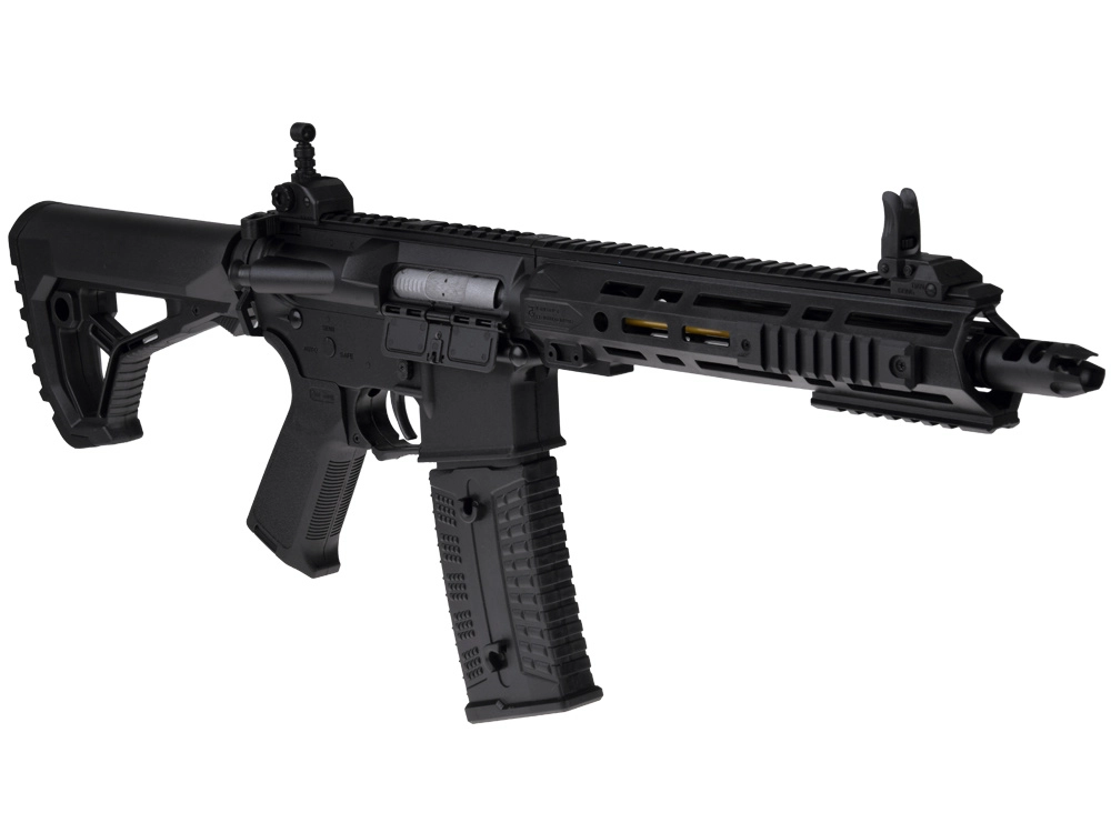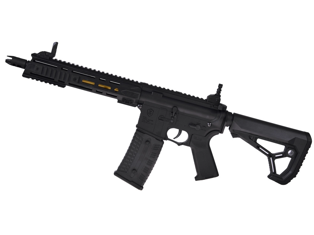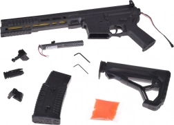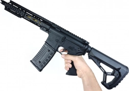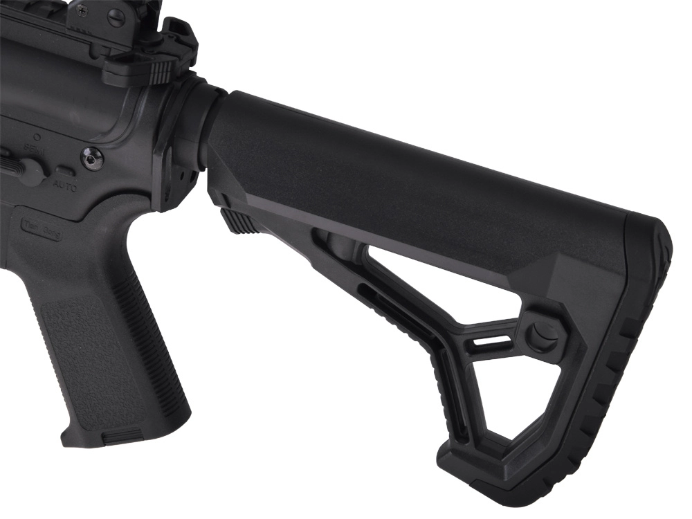 Dlouhé předpažbí s montážními lištami, sklopná mířidla a nastavitelná pažba umocňují zážitek ze hry a zlepšují ergonomii držení.
