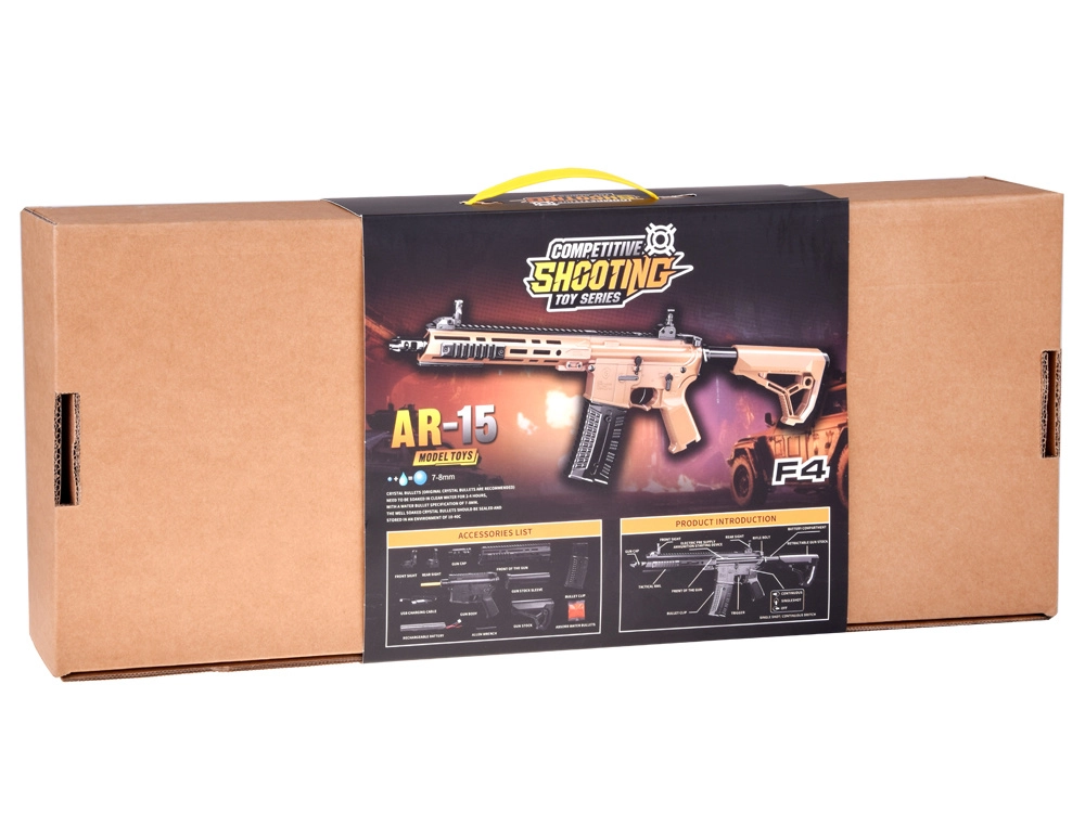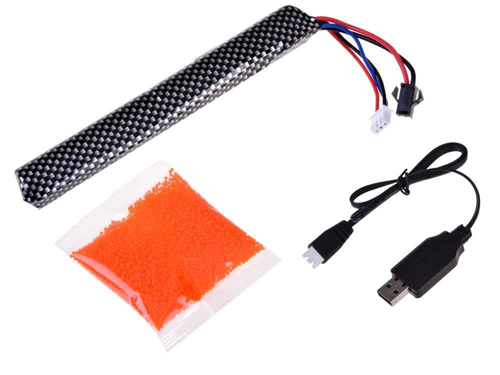 - gelová pistole F4, zásobník, akumulátor 7,4 V 1200 mAh, USB kabel, sáček gelových kuliček k přípravě, imbusový klíč, tlumič (dekorativní), 2× mířidla, pažba