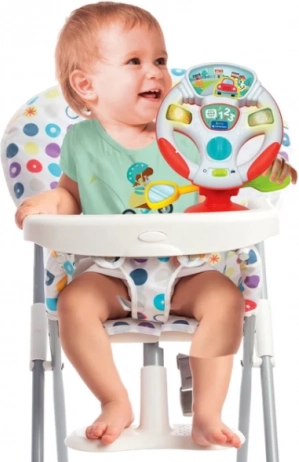 Edukační tlačítko provází děti objevováním čísel v hravých říkankách. Klíček zapíná a vypíná „motor“ a nabízí 2 herní režimy. Pohyblivé zrcátko a řadicí páka posilují jemnou motoriku a koordinaci. Díky přísavce hračku snadno upevníte na rovnou plochu – ideální na jídelní pultík nebo stůl.