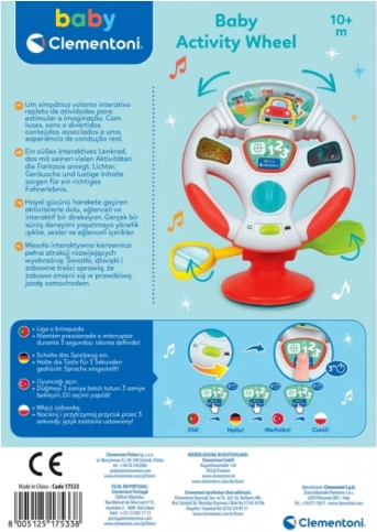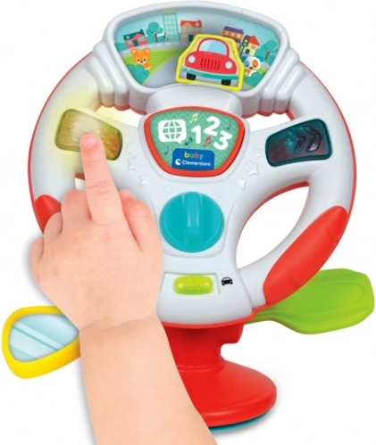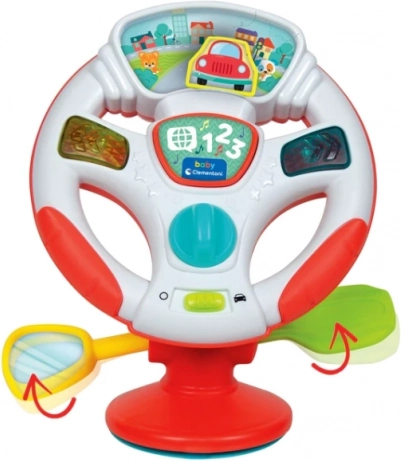Objevte radost z prvního „řízení“ s interaktivním volantem CLEMENTONI. Po otočení volantem se autíčko na barevné silnici pohybuje doprava či doleva a aktivuje obsah spojený s opravdovou jízdou. Světelné efekty LED, reálné zvuky a veselé melodie podporují vnímání a soustředění.