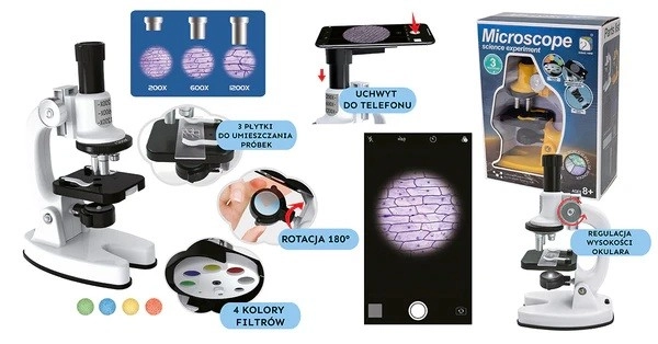 Objevte fascinující svět kolem nás s tímto kvalitním dětským mikroskopem. Nabízí 3 úrovně zvětšení 200×/600×/1200×, 4 barevné filtry pro lepší kontrast a držák na telefon pro pohodlné focení vzorků. Ideální dárek pro malé badatele a začínající vědce.