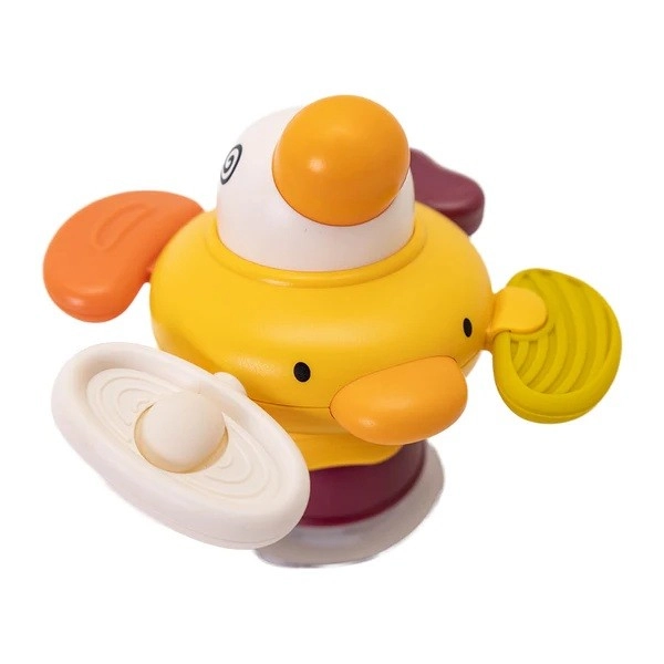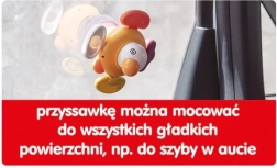 Díky přísavce kačenku snadno připevníte na hladké povrchy – například na jídelní židličku, stůl či okno v autě. Silikonové gryzátko uleví při prořezávání zoubků a otočné a posuvné prvky rozvíjejí koordinaci ruka–oko.