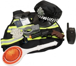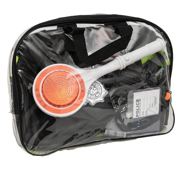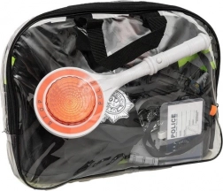 - reflexní vesta, čepice, policejní „lízátko“ (LED), vysílačka (zvuk sirény), revolver, odznak, pouta s klíčky, identifikátor, brýle, píšťalka