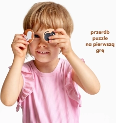 Hrajte dvěma způsoby: jako puzzle pro trénink jemné motoriky a jako hru pro rozvoj paměti a soustředění. Otočte žetony lícem dolů, losujte a přiřazujte ke své skládačce. Vyhrává ten, kdo správně doplní všechny kroužky jako první. Pro menší děti lze hrát na čas a hledat určité obrázky.