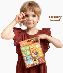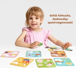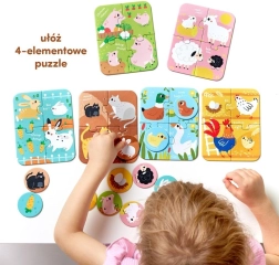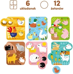 Sada přináší 6 roztomilých čtyřdílných obrázků z farmy a 12 přídavných kroužků – ke každému puzzle patří 2 žetony. Děti nejprve složí scénku a poté doplňují správné kroužky do odpovídajících míst. Barevné ilustrace motivují k objevování a učí rozpoznávat známá zvířátka.