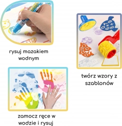 Součástí sady je bohaté příslušenství, které rozšiřuje možnosti hraní – od vodních fixů a razítek až po váleček se vzory a šablony písmen a tvarů. Vše je lehké, skladné a vhodné na doma i na cesty.