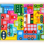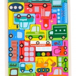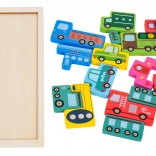 Dřevěná sada puzzlí s tématem vozidel nabízí 23 dílků s ilustracemi, jako je policie, hasičské auto, autobus, sanitka, taxi, míchačka, nakladač, vysokozdvižný vozík a další. Úkolem dítěte je přiřazovat tvary a skládat dílky do podkladové desky, čímž rozvíjí jemnou motoriku, představivost a logické uvažování.