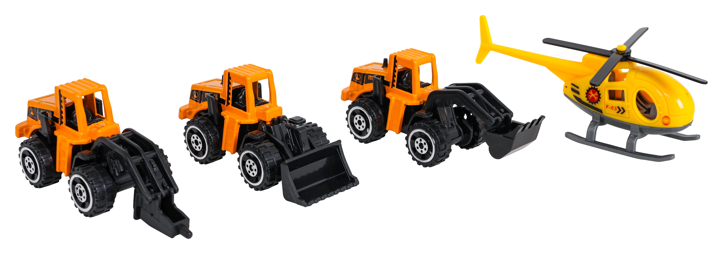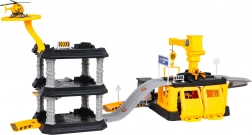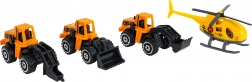 Součástí je přistávací plocha s helikoptérou a tři stavební stroje: auto s kladivem, nakladač a rýpadlo – každý s pohyblivými prvky.
