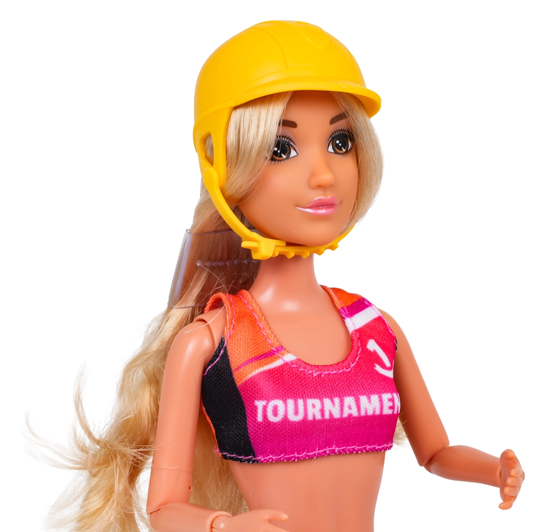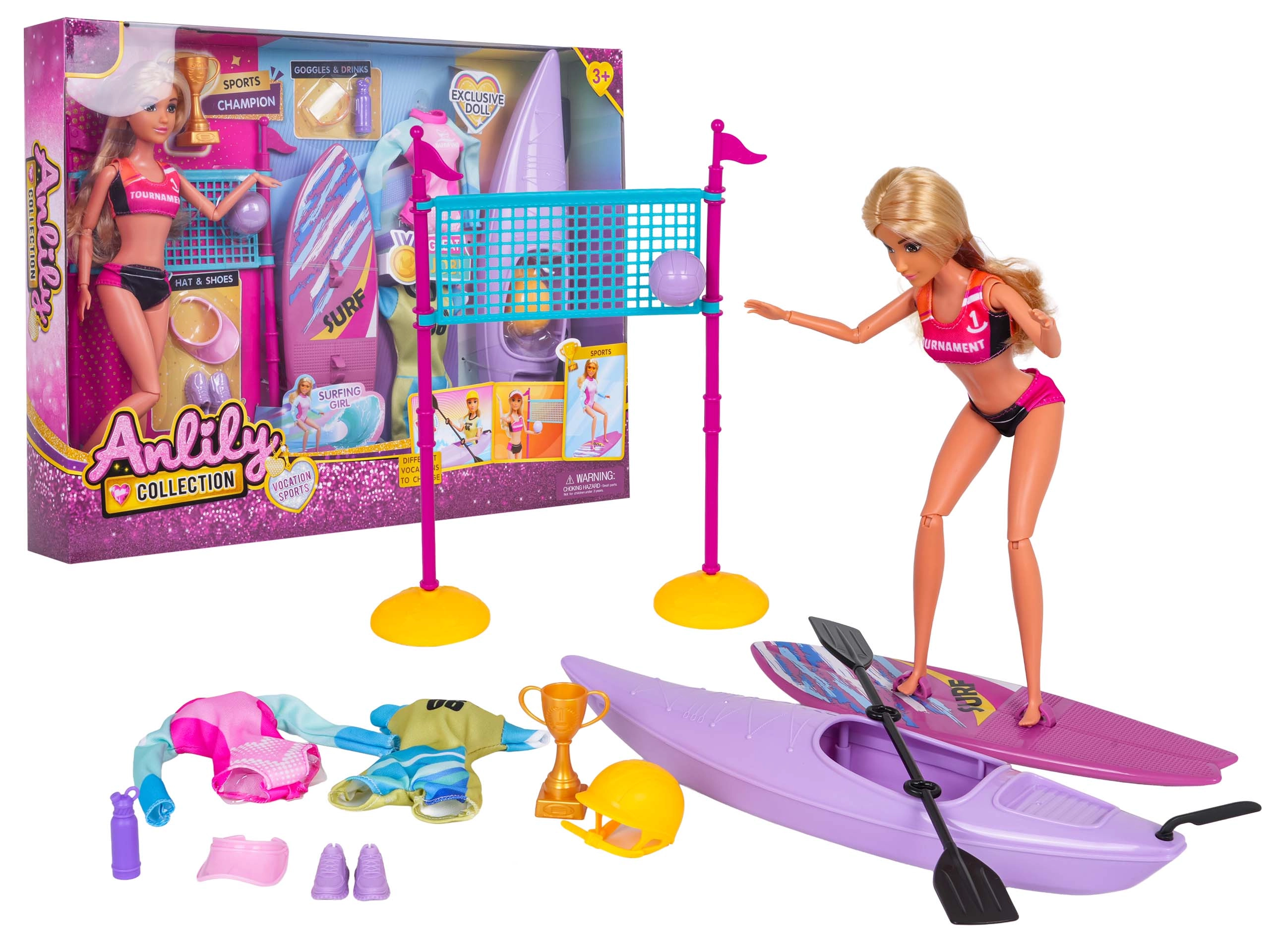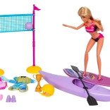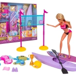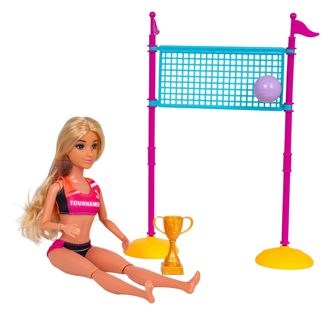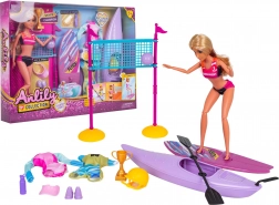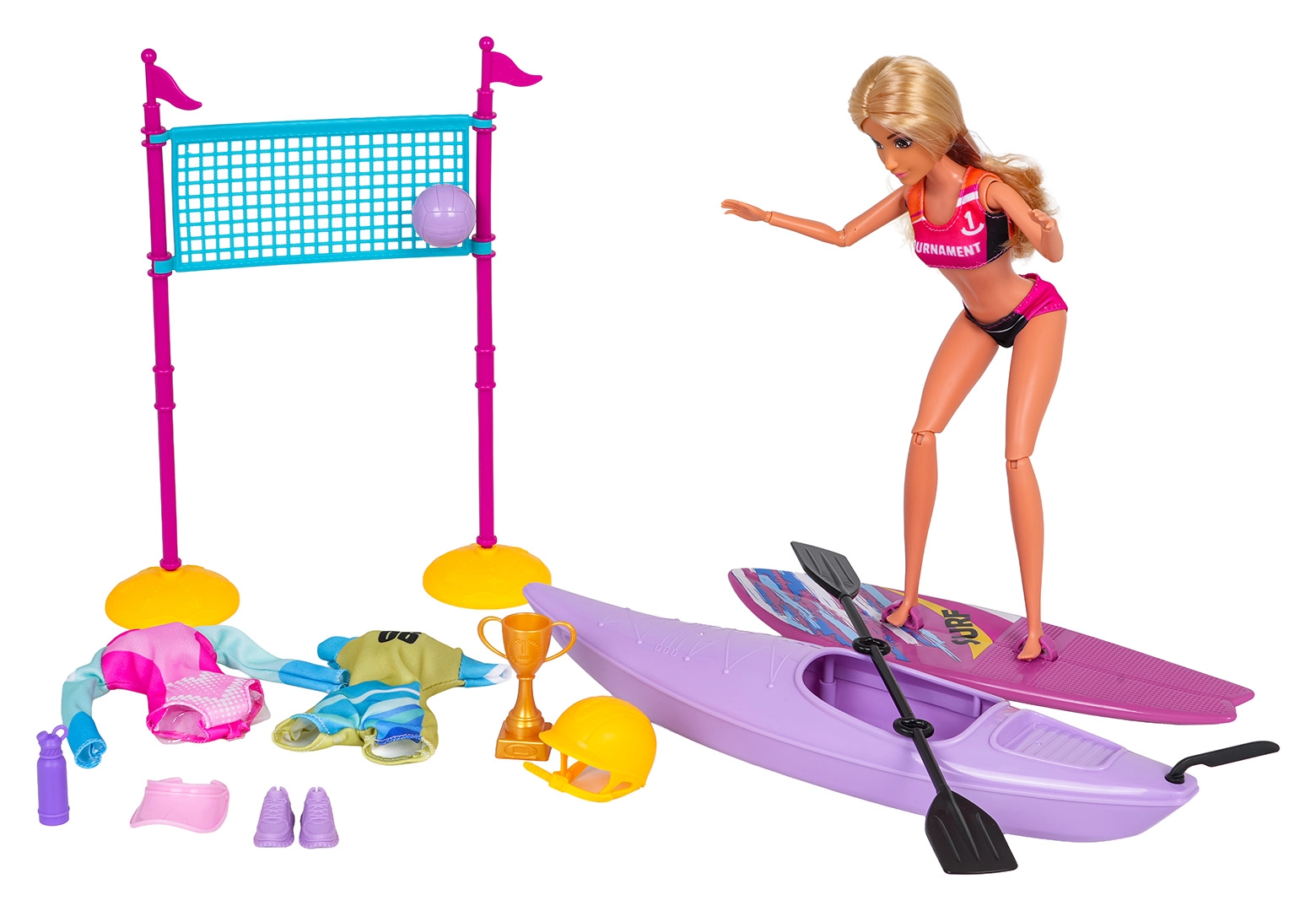 Objevte zábavu u vody i na pláži s touto všestrannou sadou – panenka Olga a bohaté příslušenství pro sportovní hry. V balení najdete surfovací prkno, kajak s pádlem, síť na volejbal s míčkem, výměnné sportovní outfit y, helmu, boty, čepici s kšiltem, brýle, láhev na vodu a trofej. Panenka má pohyblivé ruce a nohy včetně ohybatelných kolen a loktů pro realistické pózy a hraní. Skvělý dárek pro děti od 3 let.