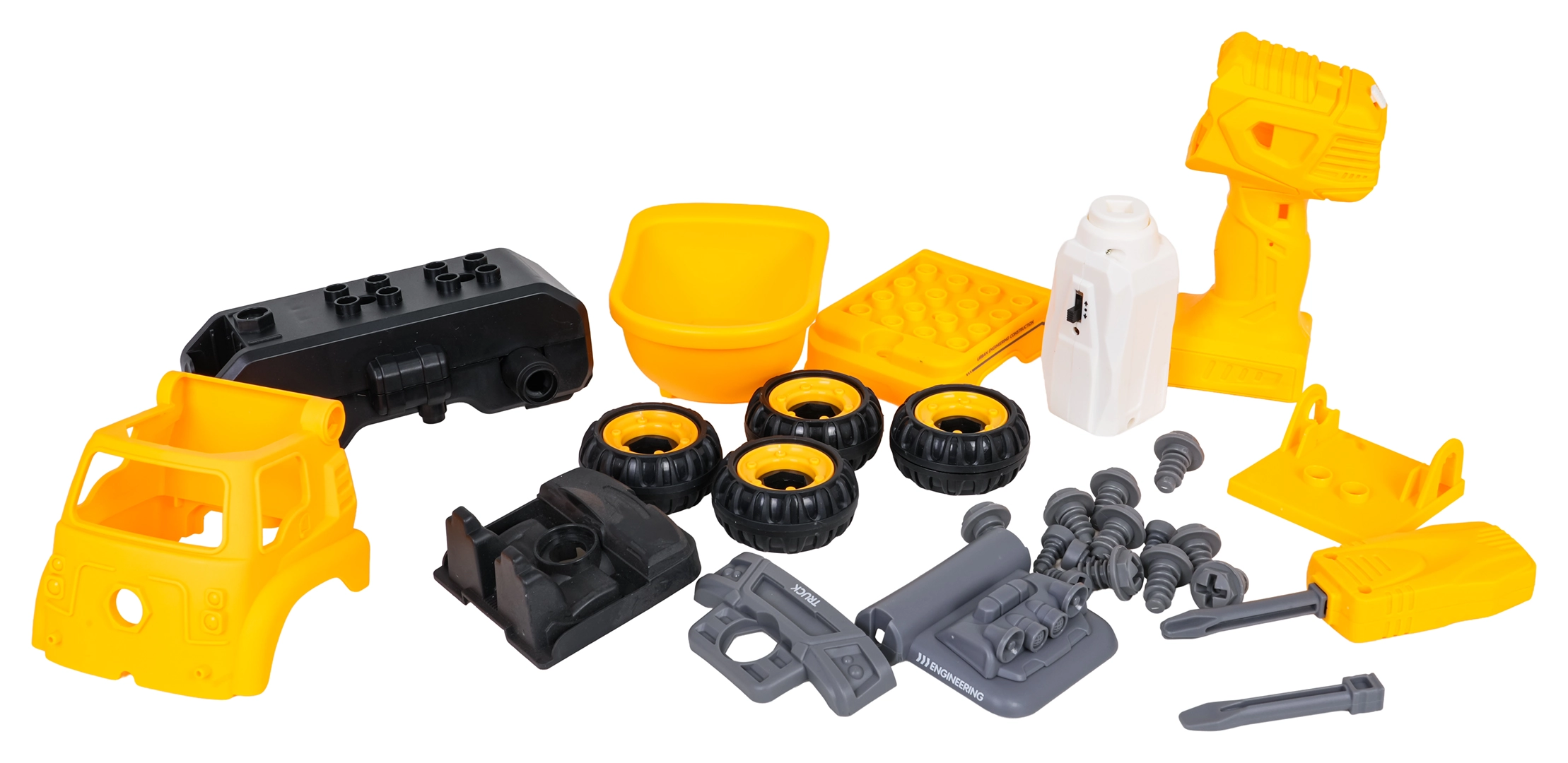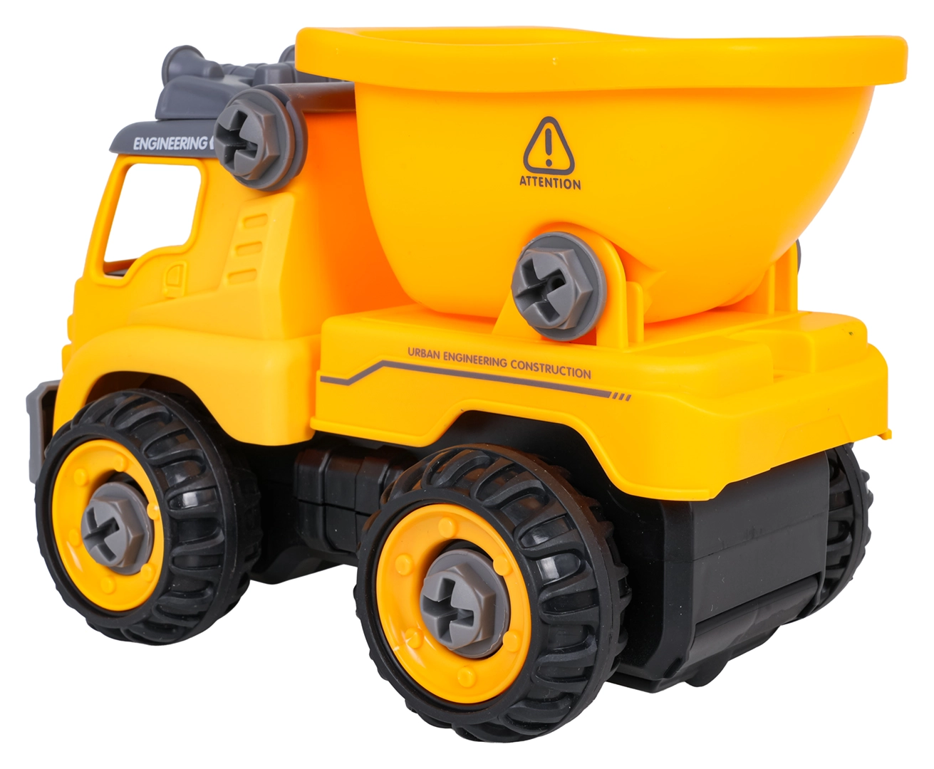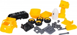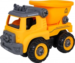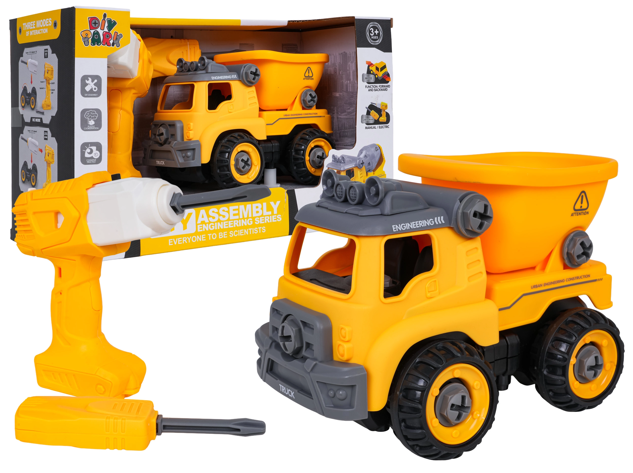 Stavební sklápěč je dodáván kompletně složený a připravený k jízdě. Pomocí přiložené bateriové vrtačky a ručního šroubováku jej mohou děti rozebrat na jednotlivé díly a opět sestavit. Vůz je vyroben z odolného plastu v živých barvách, takže zvládne každodenní hraní.