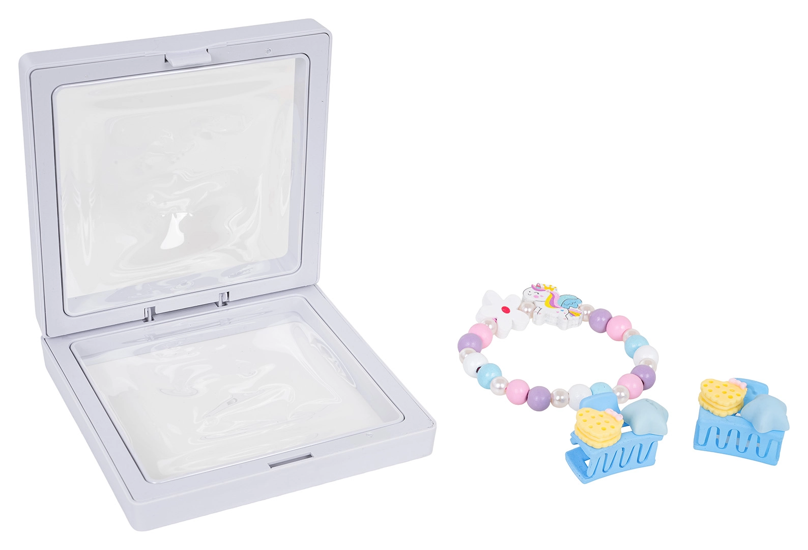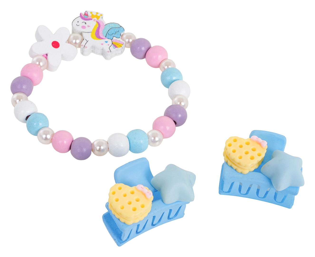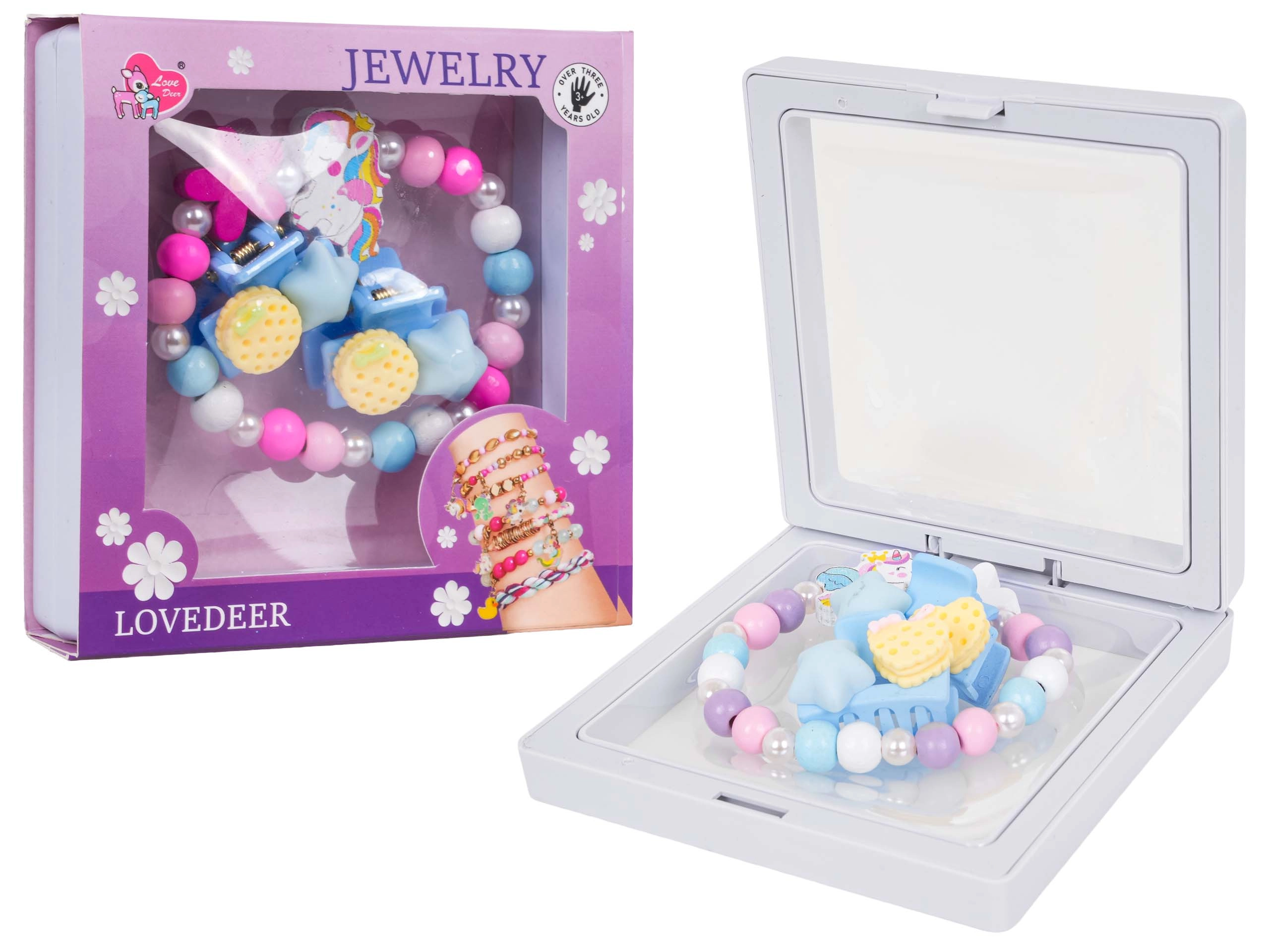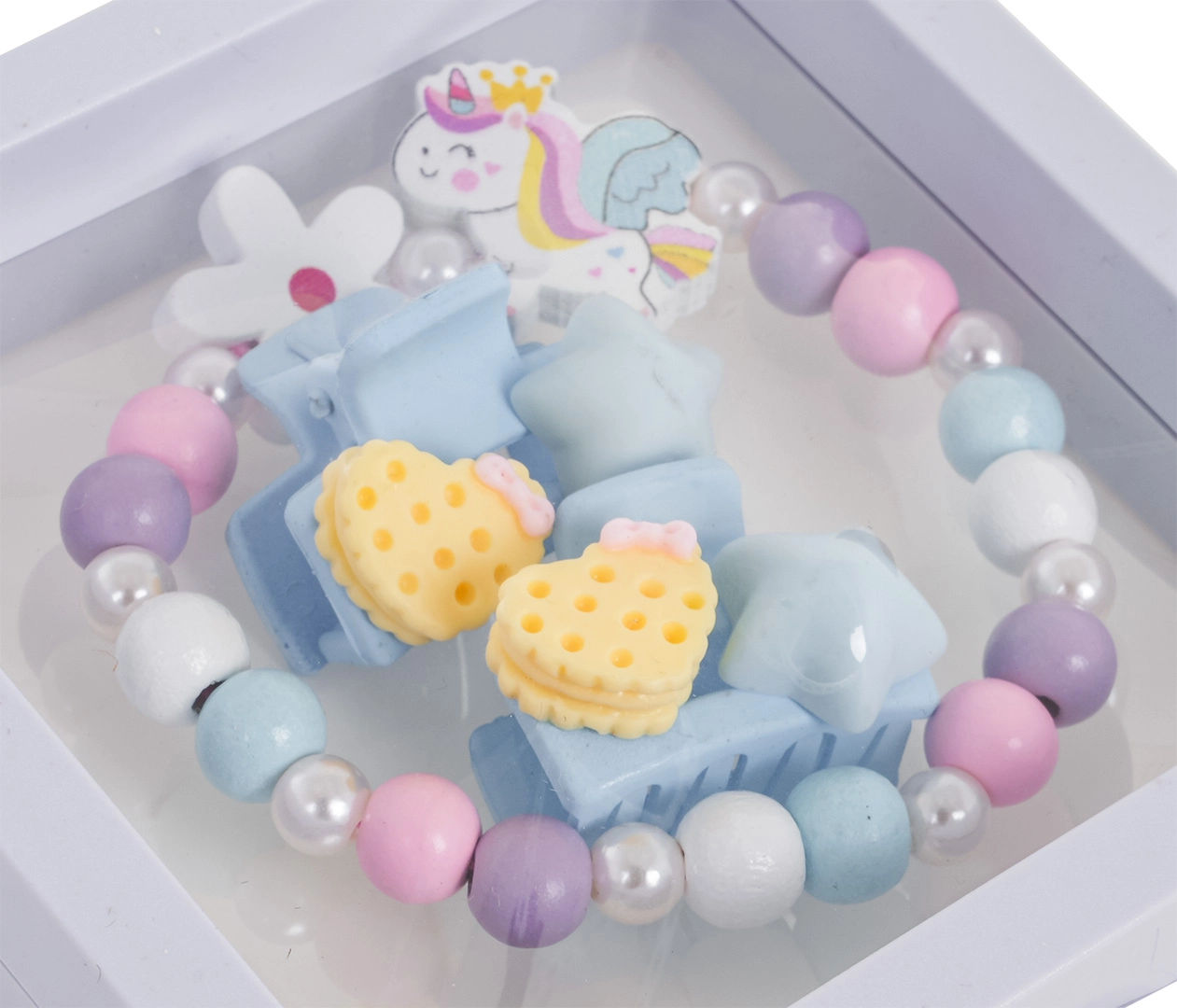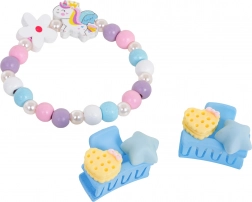Tato půvabná sada pro děti kombinuje hravý motiv jednorožce s jemnými barvami a příjemnými materiály. Náramek je vyroben z různobarevných dřevěných korálků a perliček, doplněných o roztomilý přívěsek jednorožce. Dvě praktické sponky doladí každý účes a podpoří fantazii při hraní.