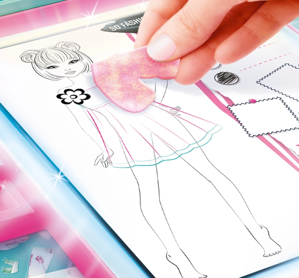 V balení najdete vše, co malý módní návrhář potřebuje: modely k obkreslování, šablony, potištěné archy a roličky, samolepící látky, barevné tužky, fix a kamínky se samolepkami pro dokonalé dozdobení. Stačí vložit 3× AAA baterie a můžete začít tvořit.