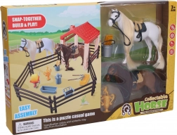 Tato kreativní sada přináší vše, co malí milovníci koní potřebují k vytvoření vlastního výběhu. Dvě detailně zpracované figurky koní (cca 14 cm) doplňuje ohrada s přístřeškem a doplňky pro péči o koně, díky nimž děti snadno vstoupí do světa farmářských příběhů.