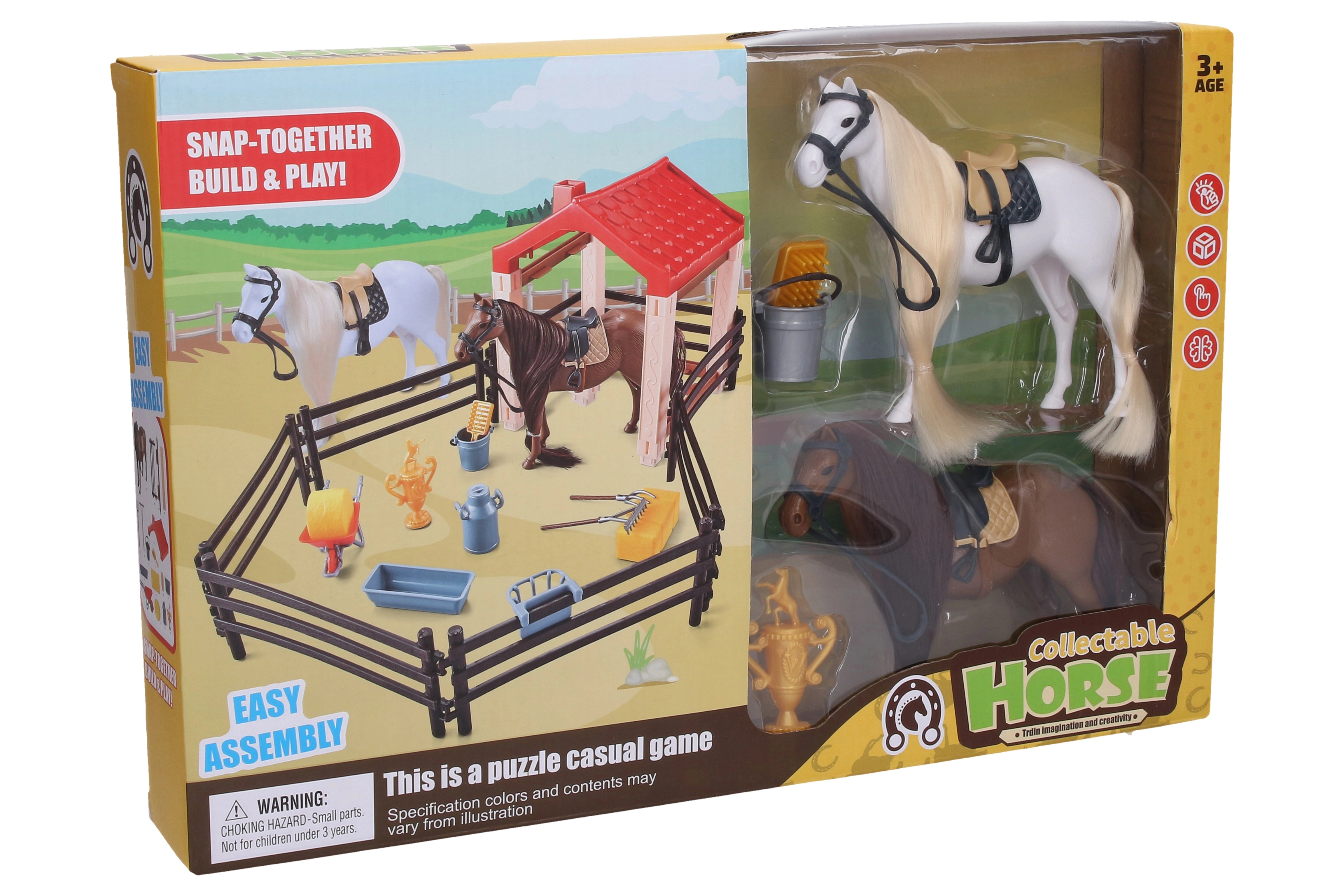 - Kompletní set: 2 koně, ohrada, přístřešek a příslušenství pro péči