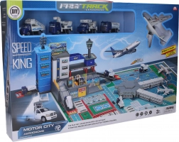 • Kompletní set – letištní garáž/plocha, 4 kovová autíčka, 1 kovové letadlo