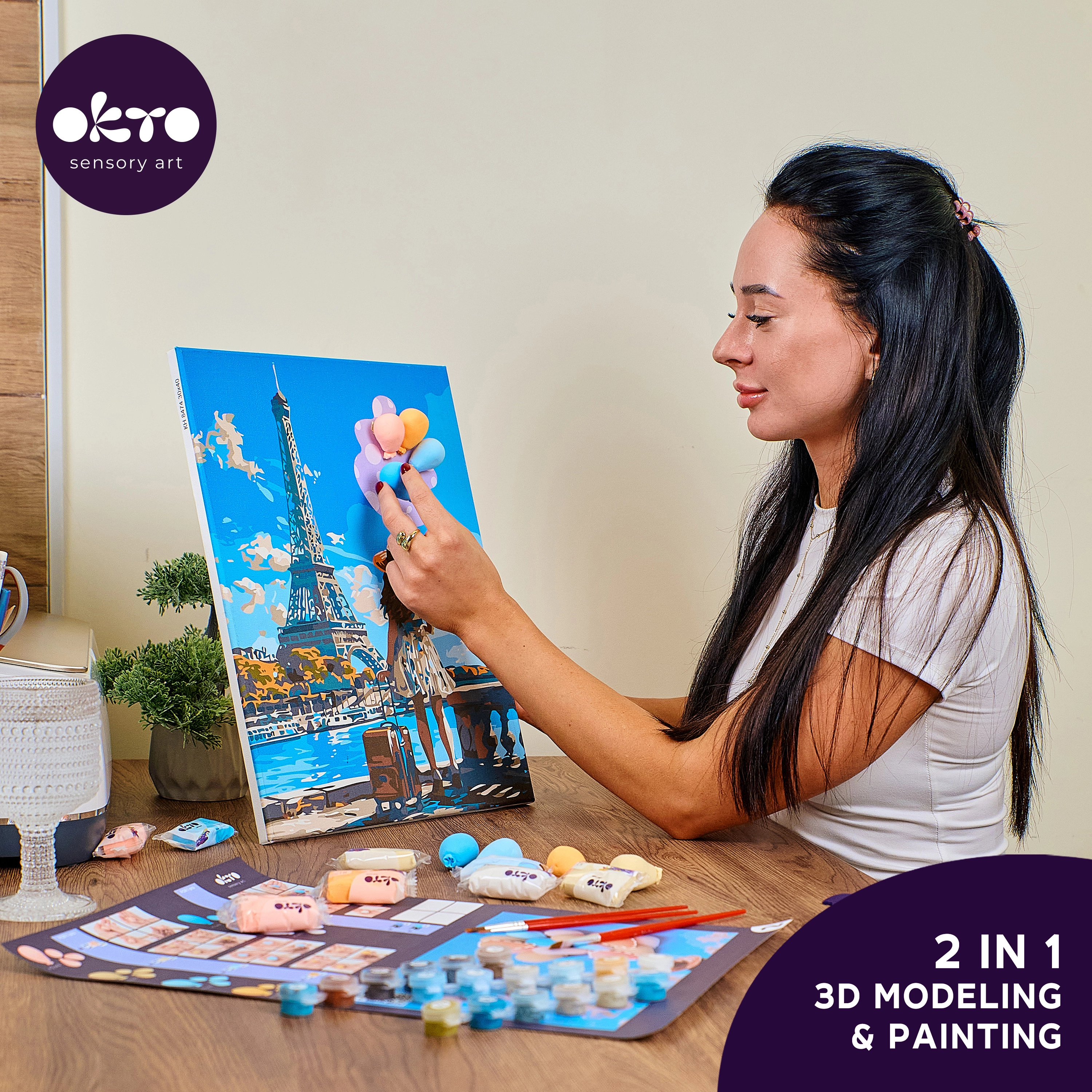 Tato kreativní sada OKTO kombinuje malbu s 3D modelováním, takže si doma vytvoříte jedinečný obraz s motivem Paříže. Díky předloze a návodu krok za krokem získáte plastické prvky, které obrazu dodají hloubku a styl. Ideální jako dárek i dekorace do interiéru.
