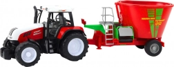 - červeno-bílý traktor, červený přívěs s míchadlem