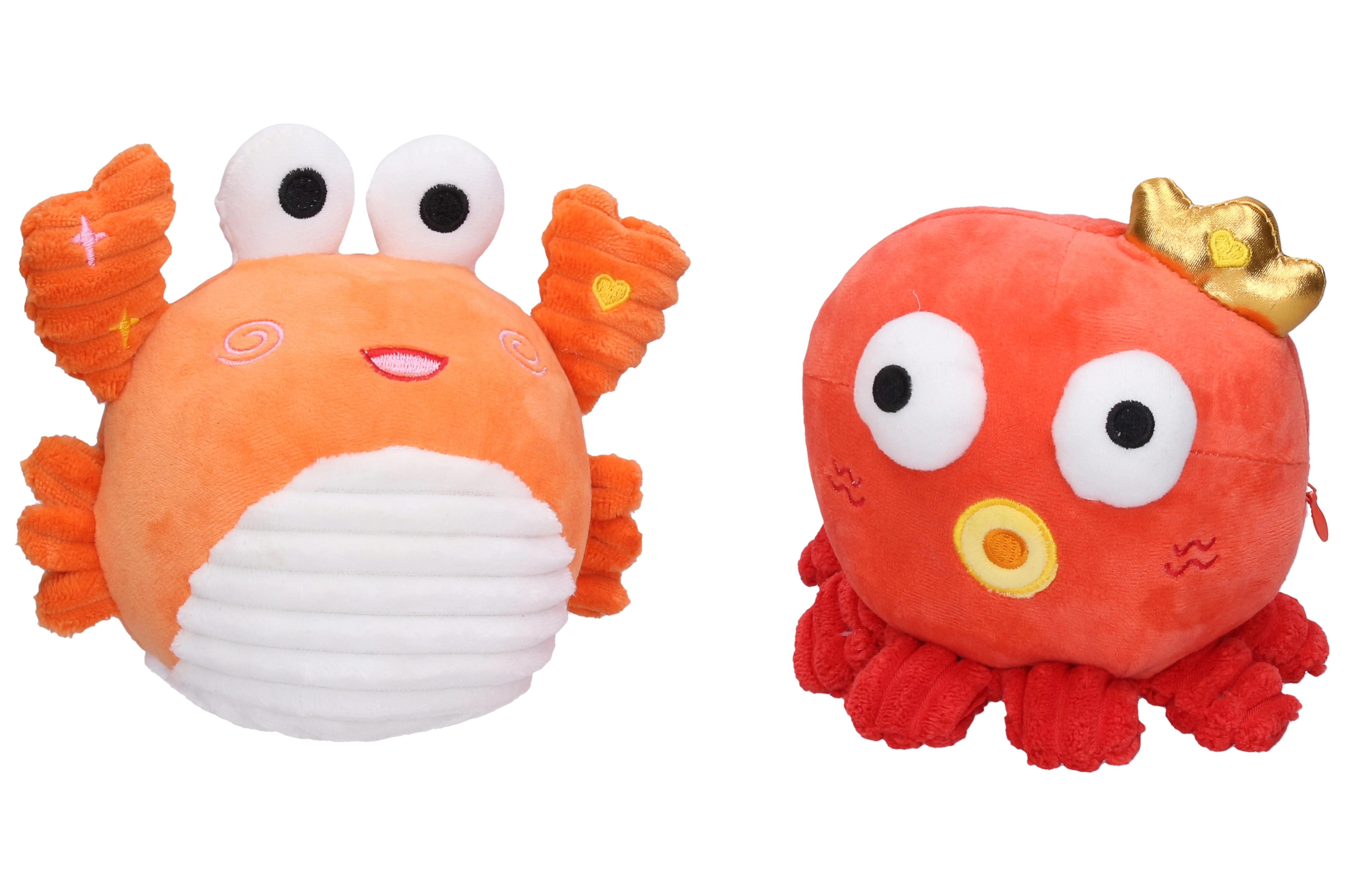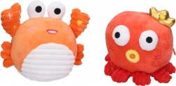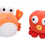 Na výběr jsou 4 roztomilé varianty – krab, kuře, modrá chobotnice a červená chobotnice. Každé zvířátko má svůj ovládací prvek (klepítko, křídlo, čepici/korunku), takže děti rychle pochopí, jak hračku používat. Vypnutí je řešeno praktickým on/off přepínačem uvnitř hračky a zadní zip umožňuje snadný přístup k bateriím.