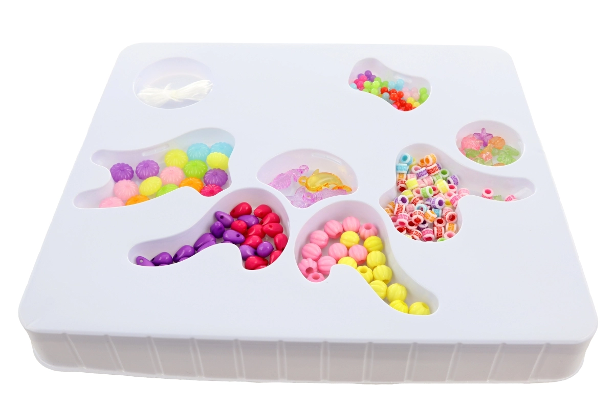 Krabička je přehledná a praktická na ukládání, takže se korálky snadno třídí a přenášejí. Díky různým tvarům a barvám děti vytvářejí náramky, náhrdelníky a další originální doplňky.